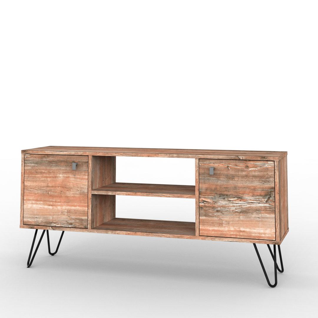 El rack de TV de la línea industrial se caracteriza por su acabado rústico. El diseño está compuesto por un cuerpo principal de melamina símil madera y patas de hierro macizo curvadas, las cuales poseen una felpa antideslizante para evitar cualquier inconveniente con el suelo.
