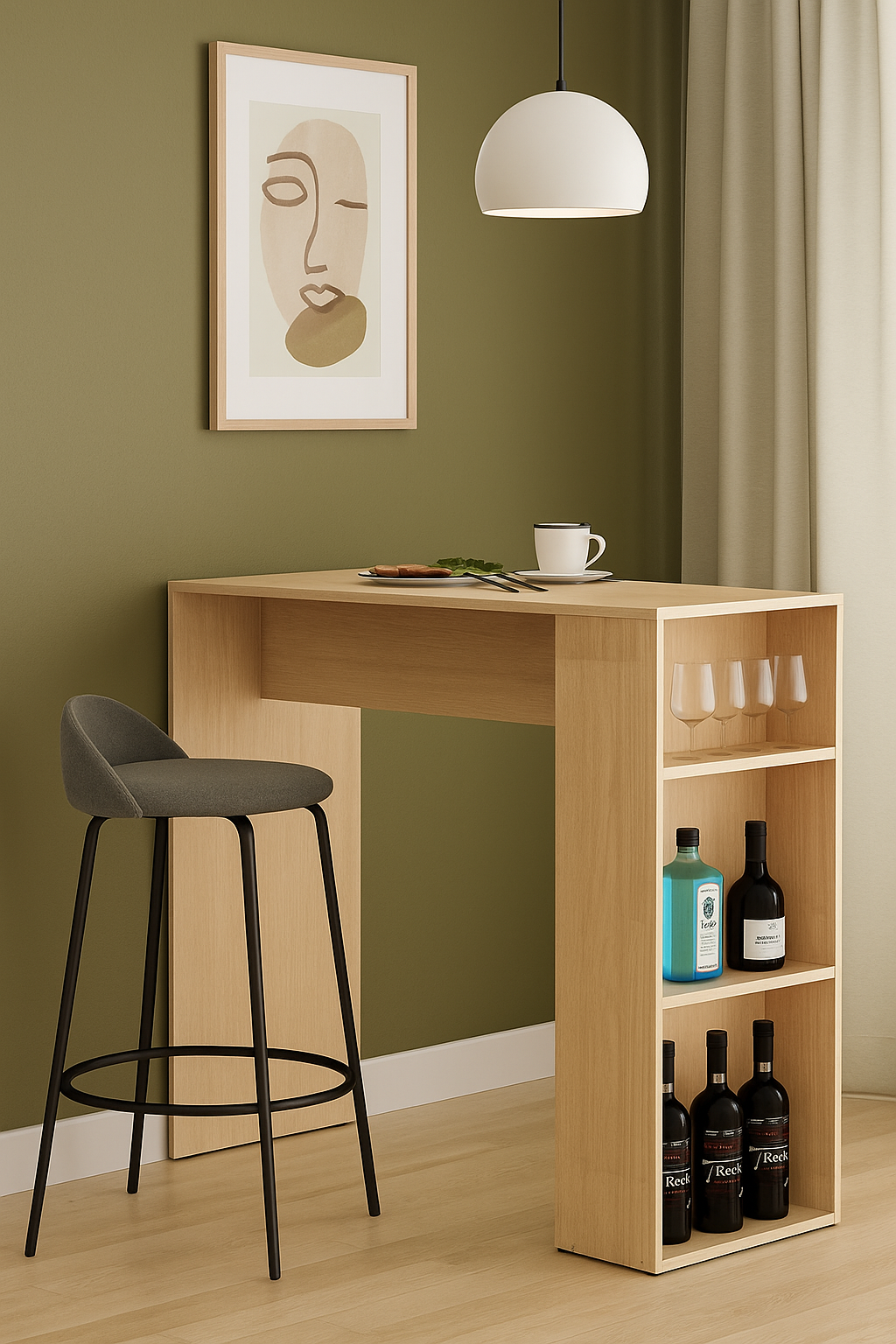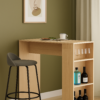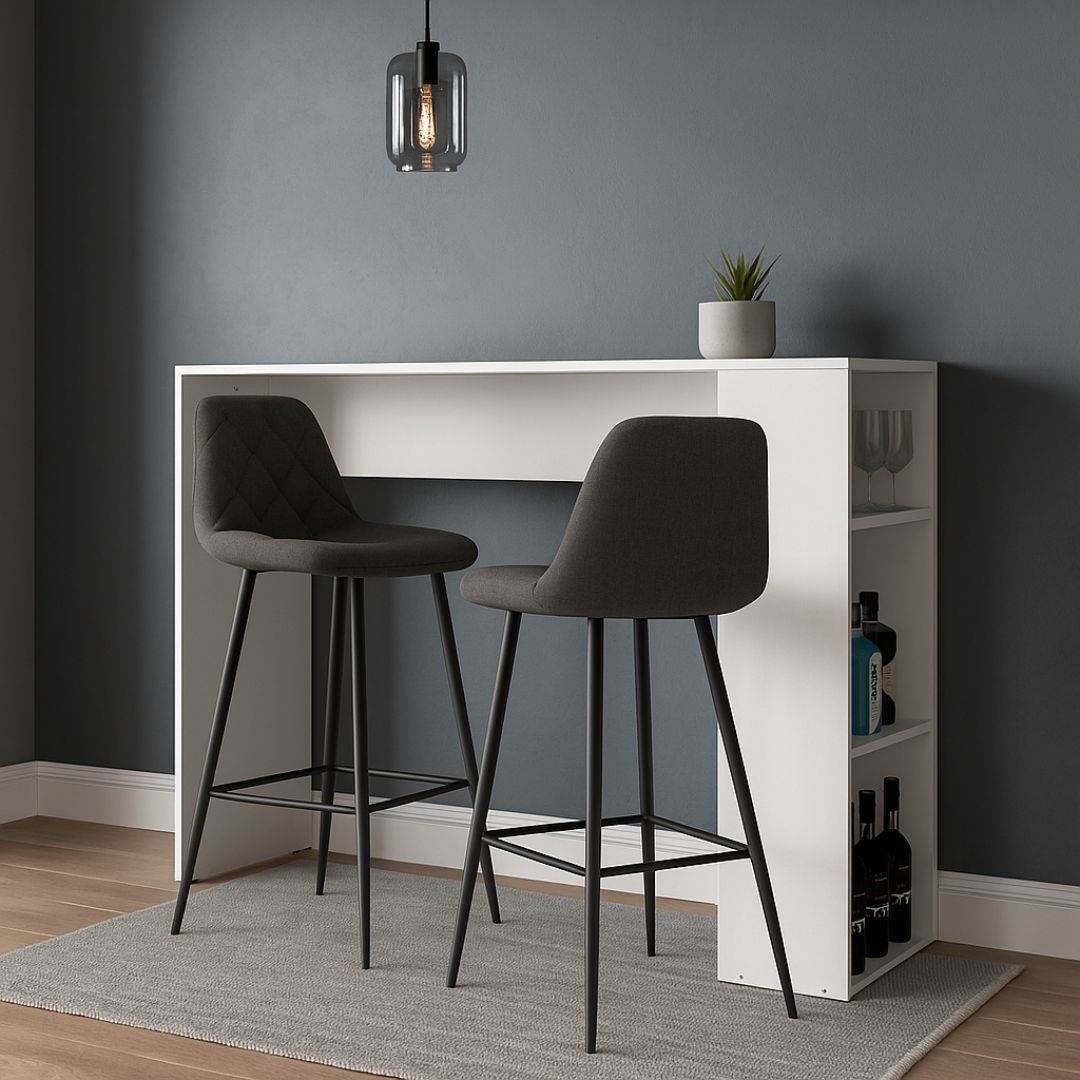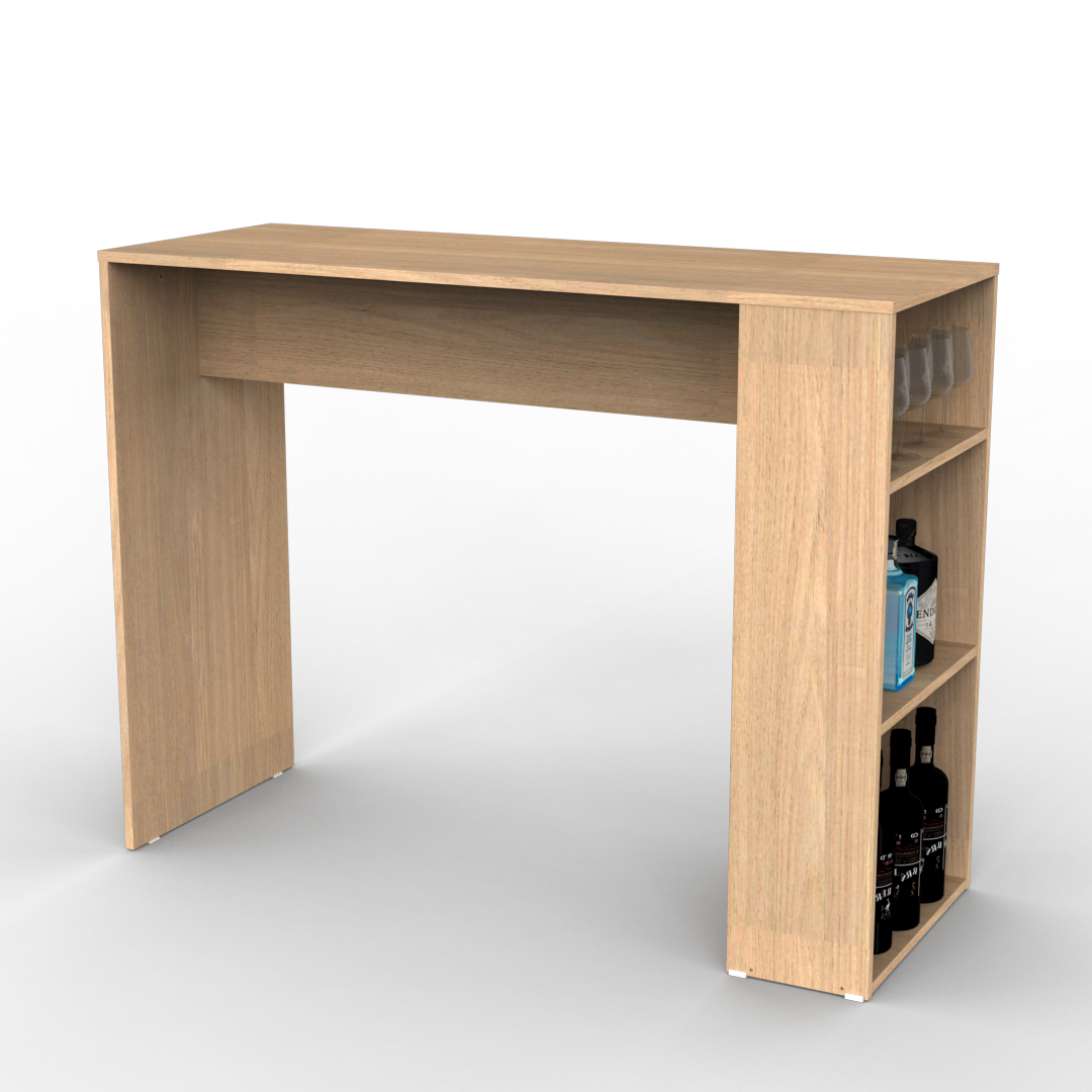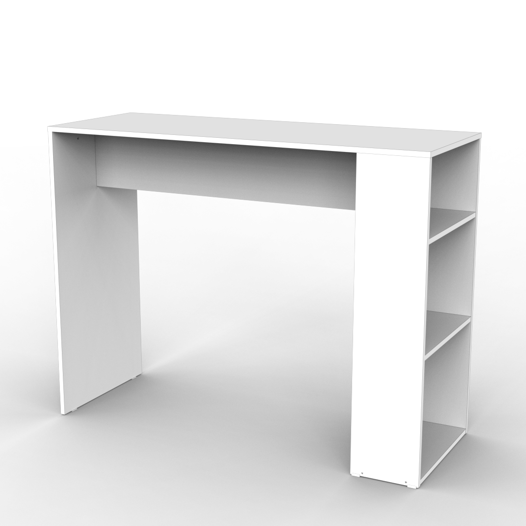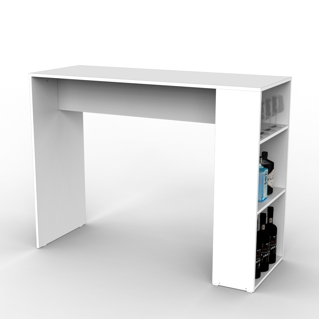 La barra desayunadora es un mobiliario que cuenta con 3 divisiones en uno de sus laterales dado por 2 estantes. Este diseño está pensado para ser utilizado en el espacio de cocina y lo podés encontrar en color blanco completo.