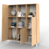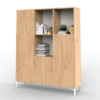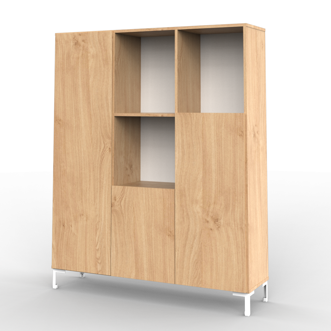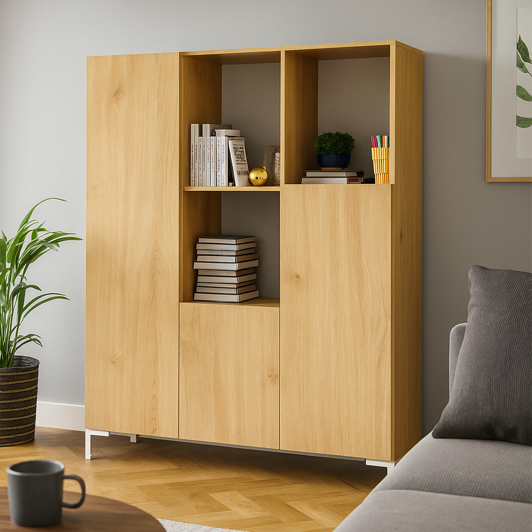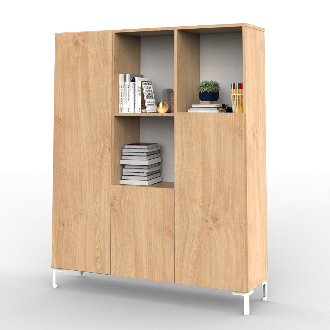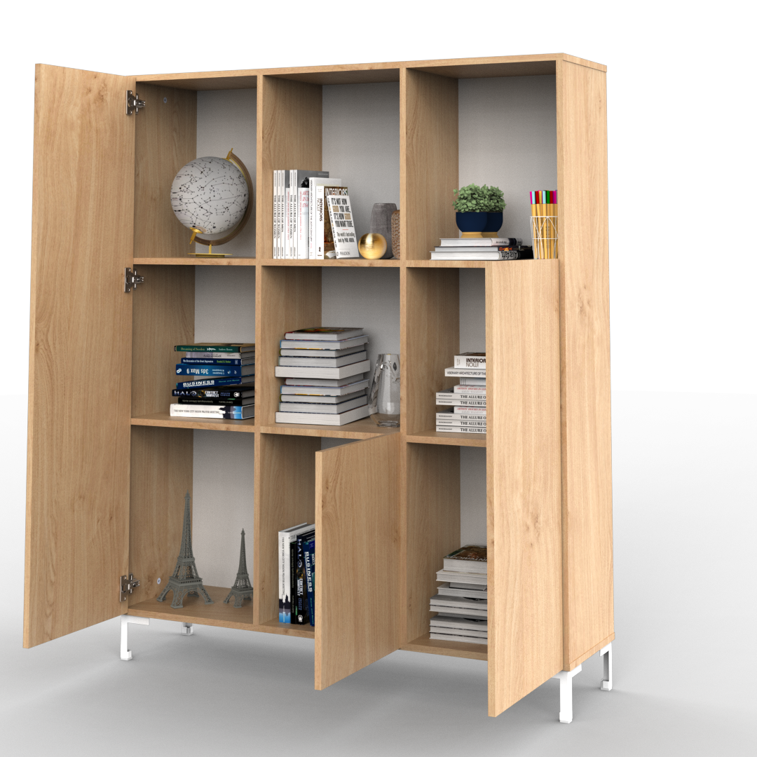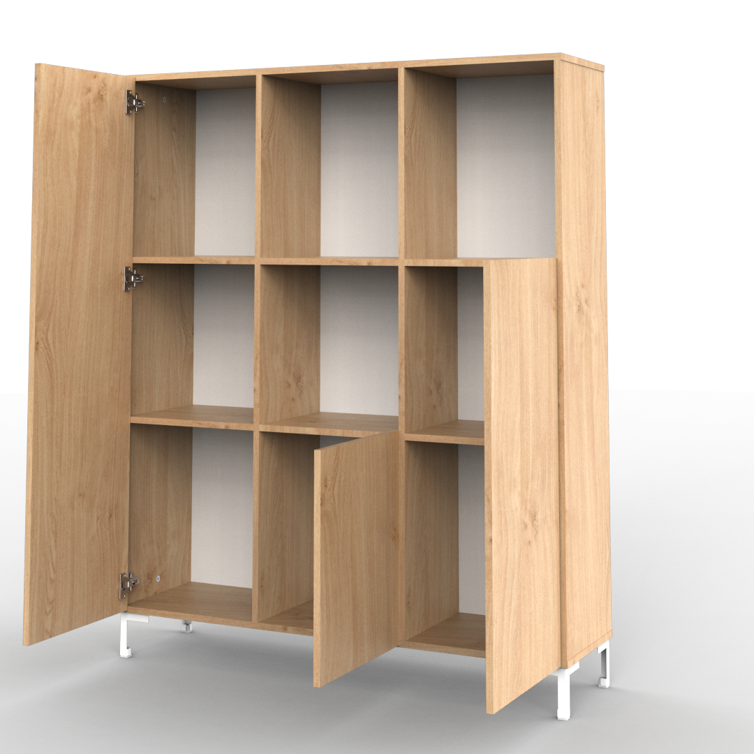 Construido en melamina con un diseño nórdico este mueble posee nueve divisiones internas, seis cerradas con 3 puertas y tres libres puede ejercer varios usos dependiendo del ambiente en el que se lo utilice.