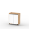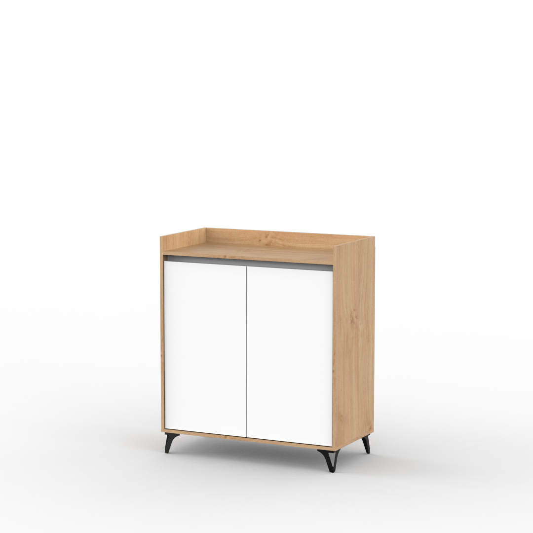 Mueble bajo auxiliar de cocina fabricado en melamina de 15mm en combinación de color Kendal y Blanco. Ideal para apoyar microondas, freidora de aire u otros electrodomésticos, cuenta con doble puerta y estantes internos para organizar vajilla, alimentos o utensilios. Su diseño moderno con patas elevadas aporta estilo y facilita la limpieza del piso, convirtiéndolo en una solución práctica y funcional para cualquier cocina.