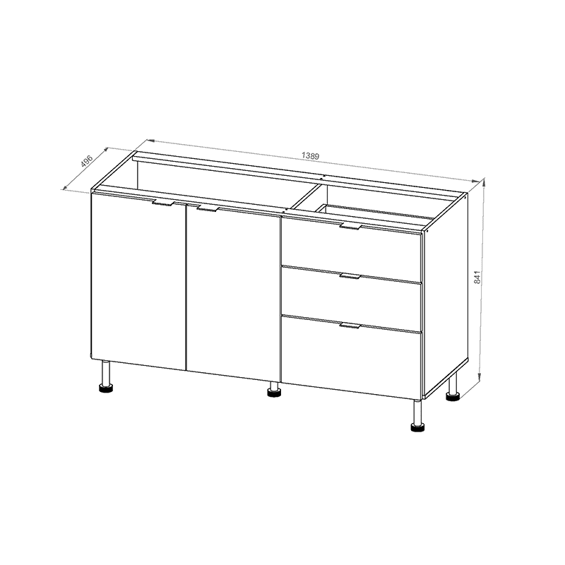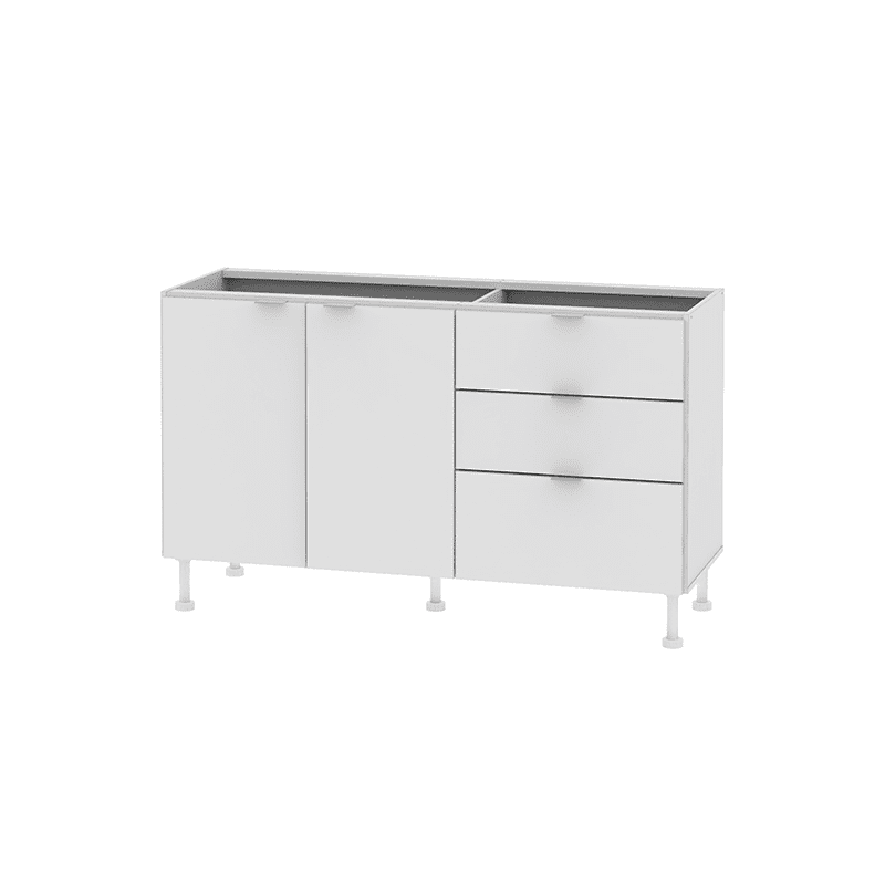 Este bajo mesada es el más amplio de la línea confort con 140 cm de ancho, construido en melamina con las opciones de color Blanco, Wengue o Roble Kendal.