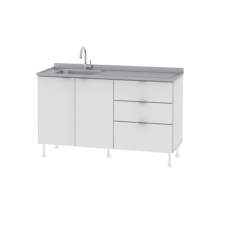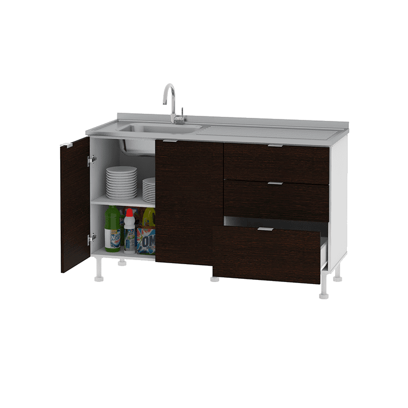 El diseño cuenta con un cuerpo principal que posee 3 cajones pequeños y una división interna más grande que está cerrada con dos puertas y dividida con un estante. Si bien es ideal para todo tipo de cocinas, también puede adaptarse perfectamente al lavadero.