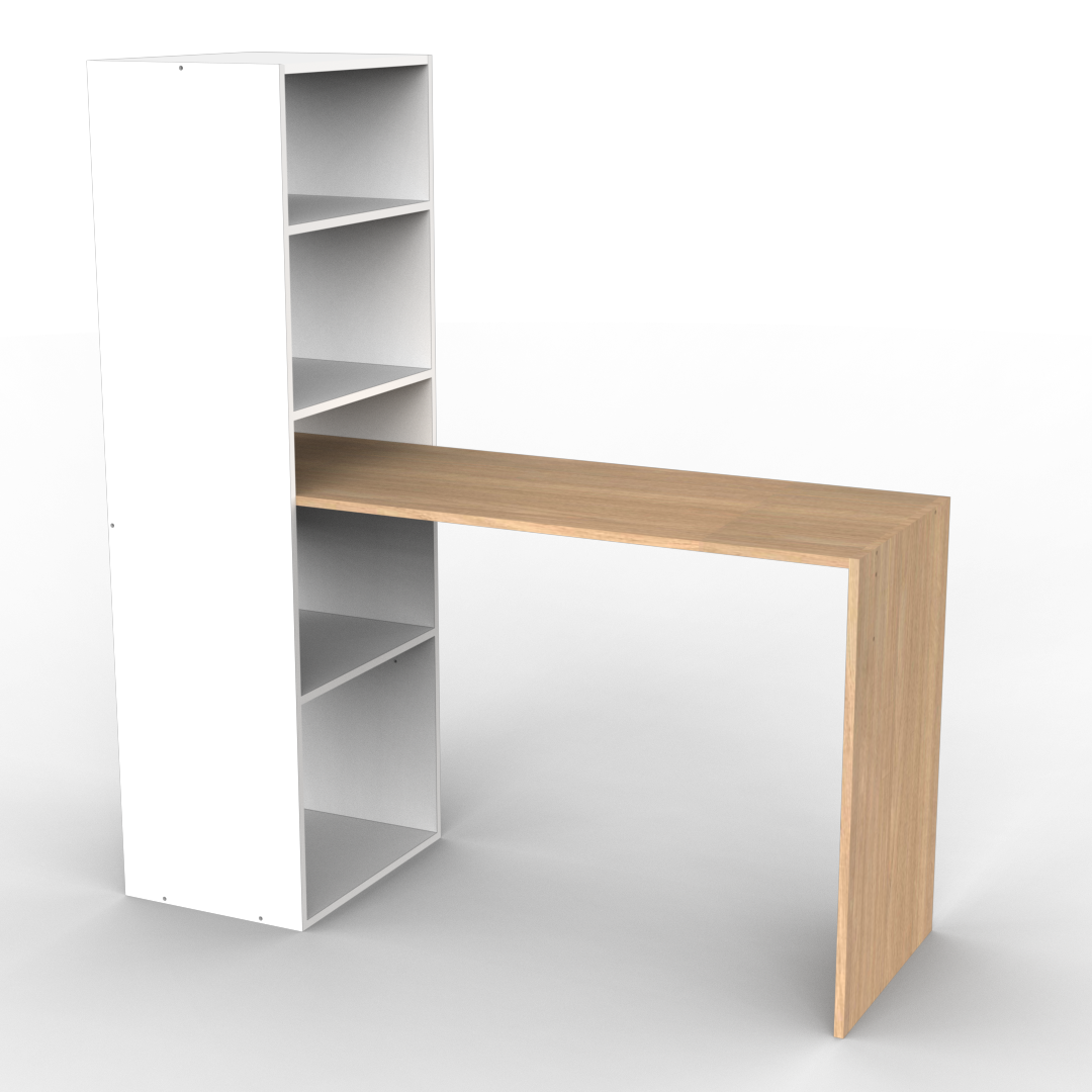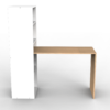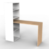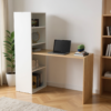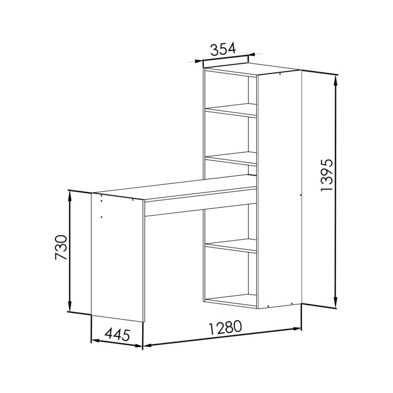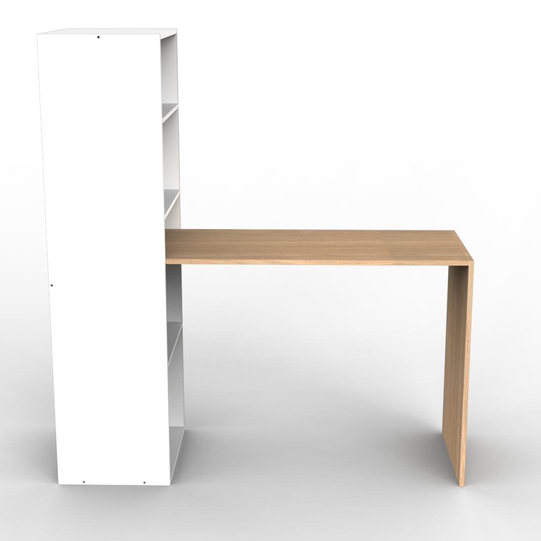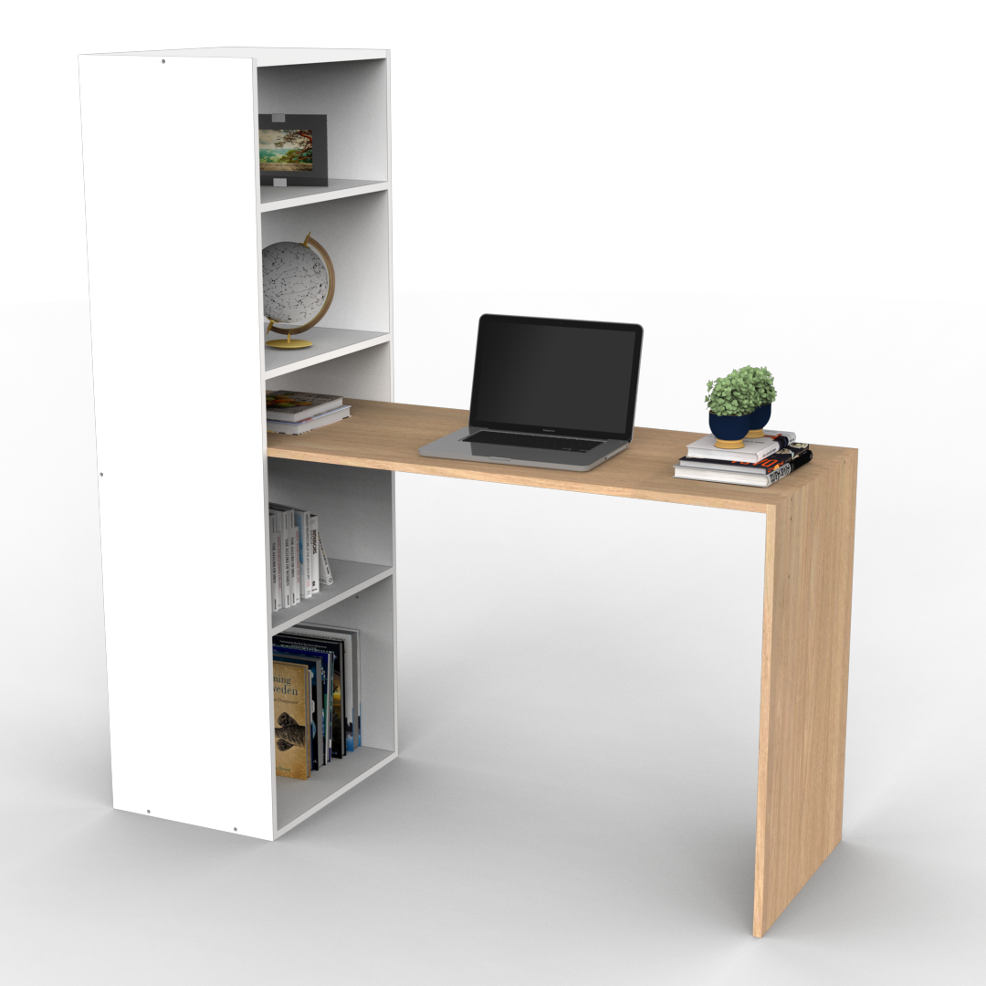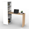 Este escritorio tiene una biblioteca vertical en uno de sus laterales, la cual cuenta con cuatro divisiones internas dadas por tres estantes regulables y una división más chica que se genera por el apoyo del escritorio con la biblioteca. Todo esto hace que tenga muy buena capacidad de almacenamiento.