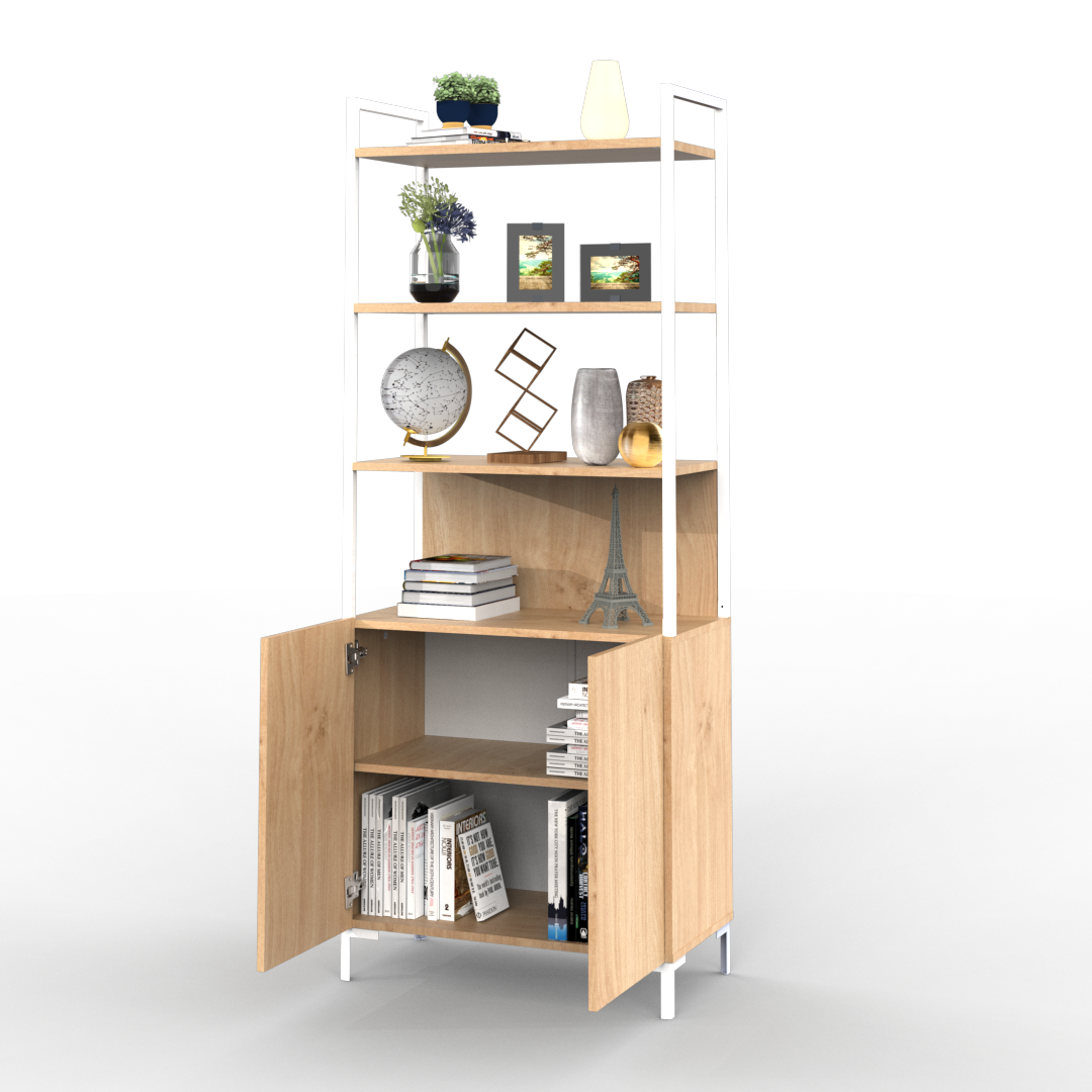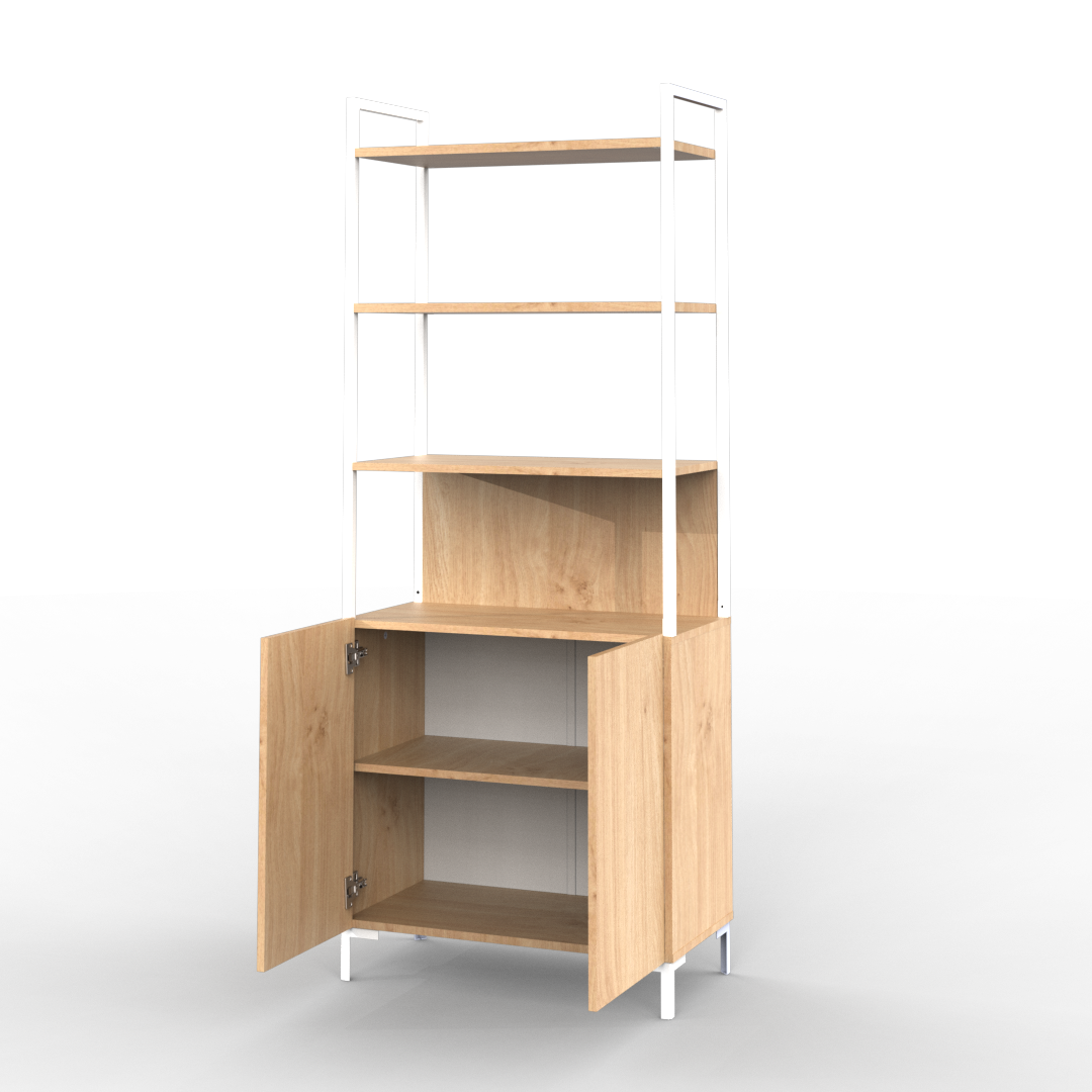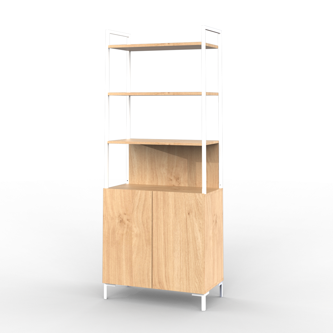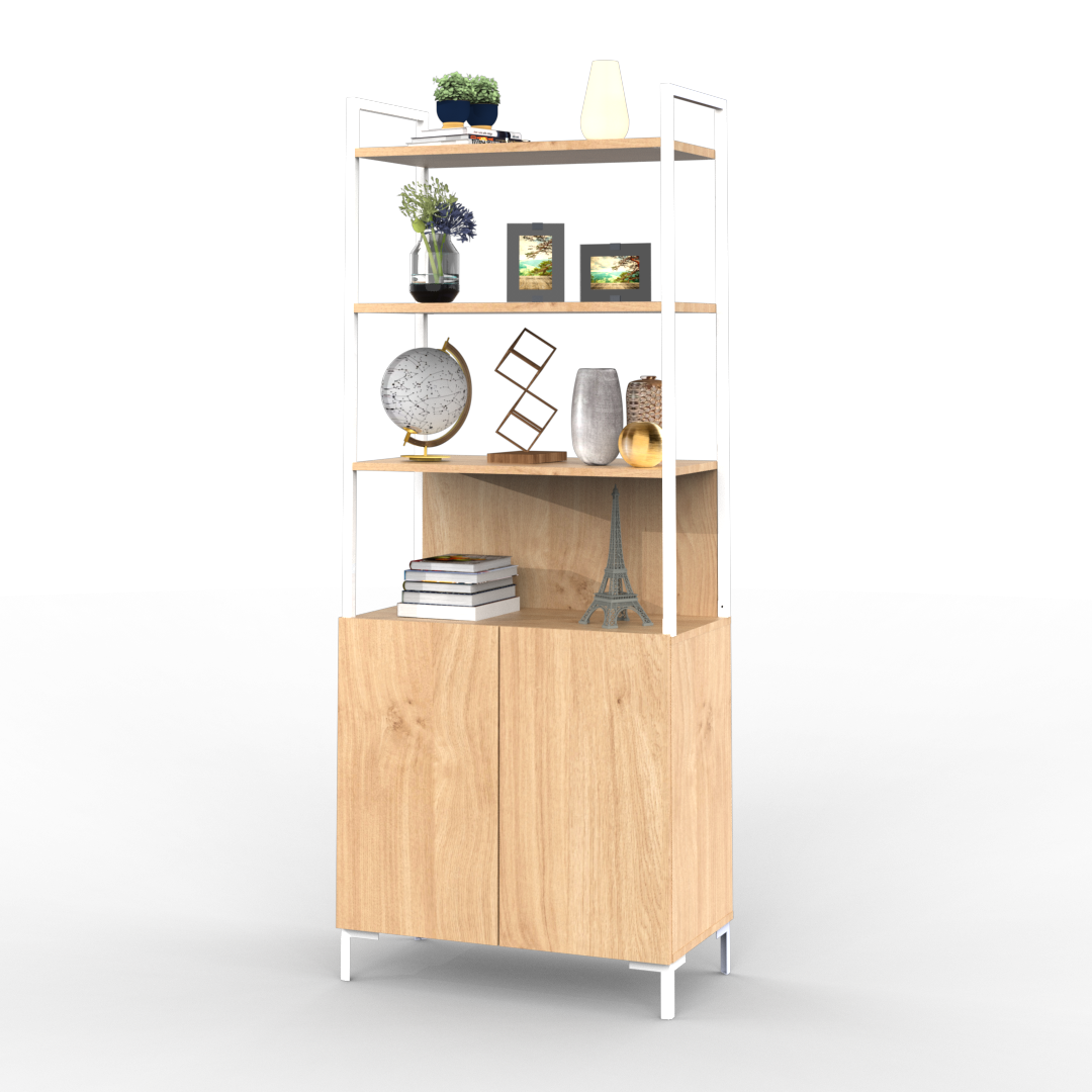 La estantería de la línea Oslo se caracteriza por su diseño minimalista, cuenta con un cuerpo principal de melamina. Con tres estantes y una división inferior con dos puertas otorgando así una buena capacidad de almacenamiento.