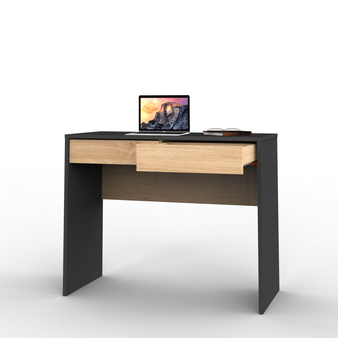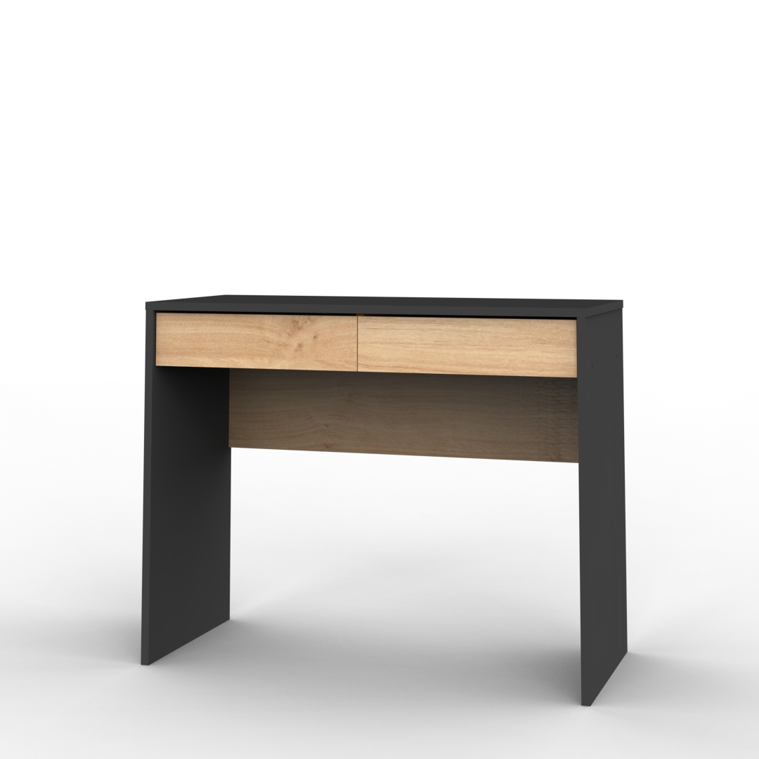 Este escritorio pequeño y elegante es la opción ideal para espacios reducidos, combinando un diseño moderno con funcionalidad. Destaca por su acabado único, que mezcla texturas de madera en veta con superficies lisas, creando un look sofisticado y contemporáneo. Cuenta con dos cajones, perfectos para mantener el orden y darle estilo a cualquier rincón de tu hogar o oficina.
