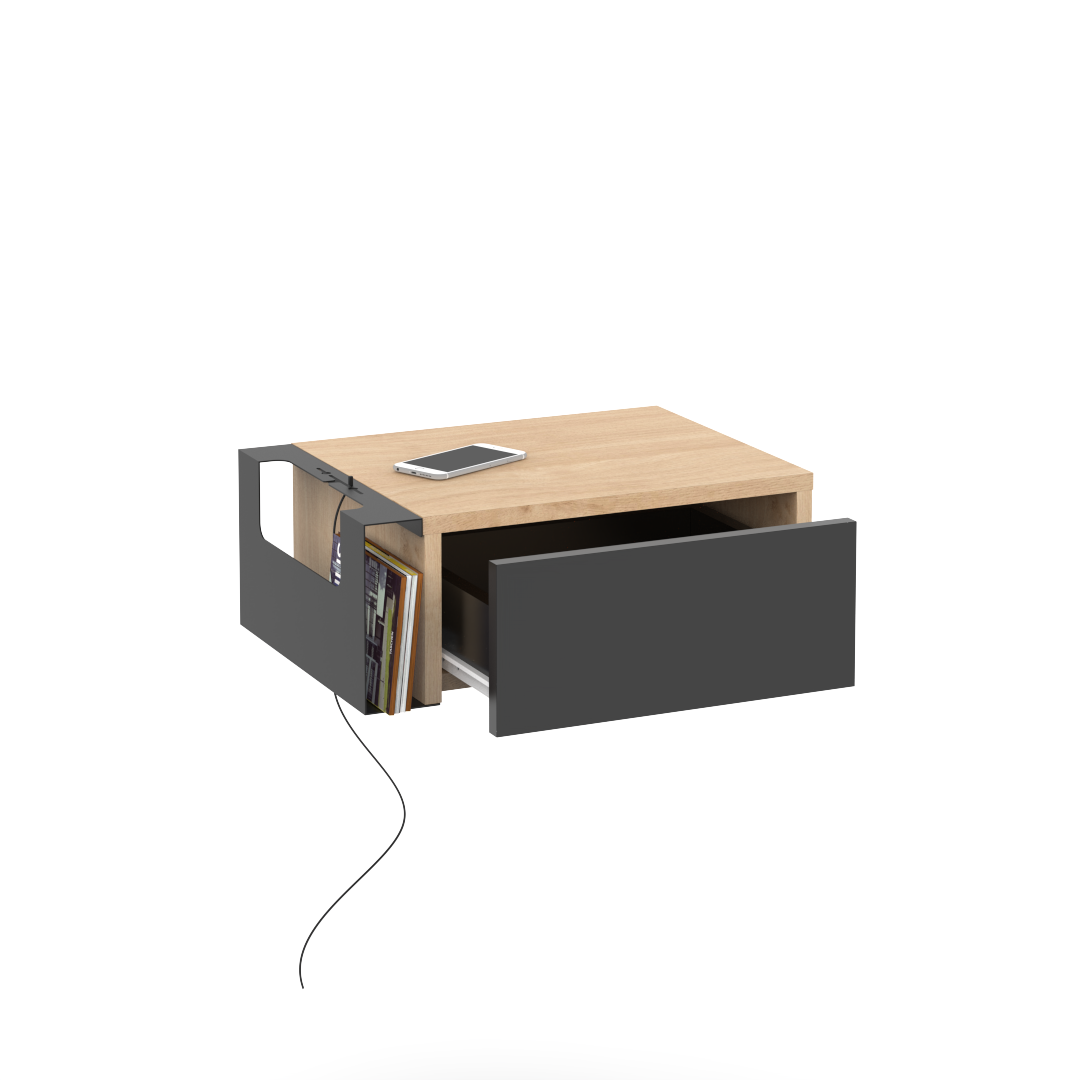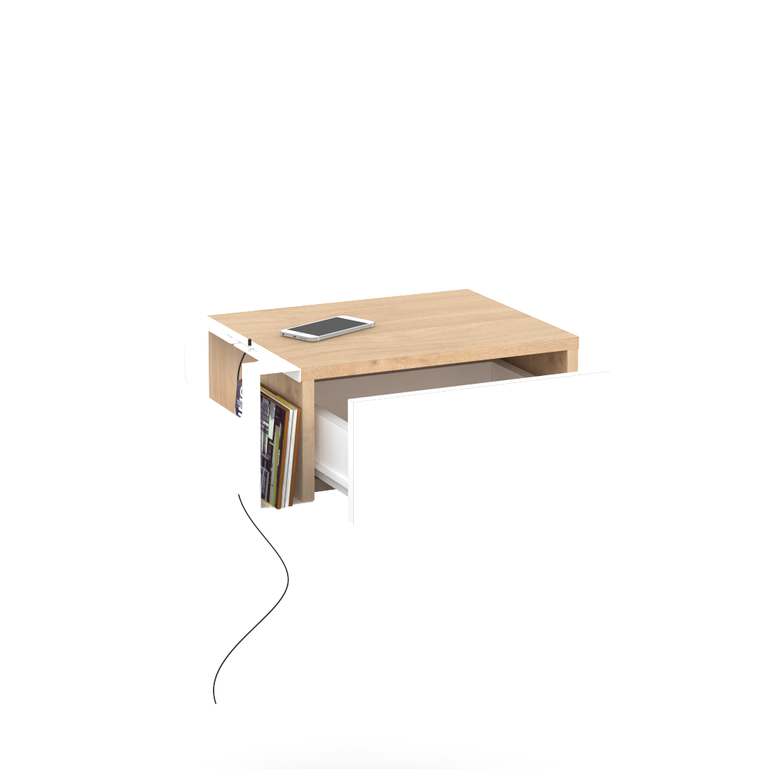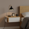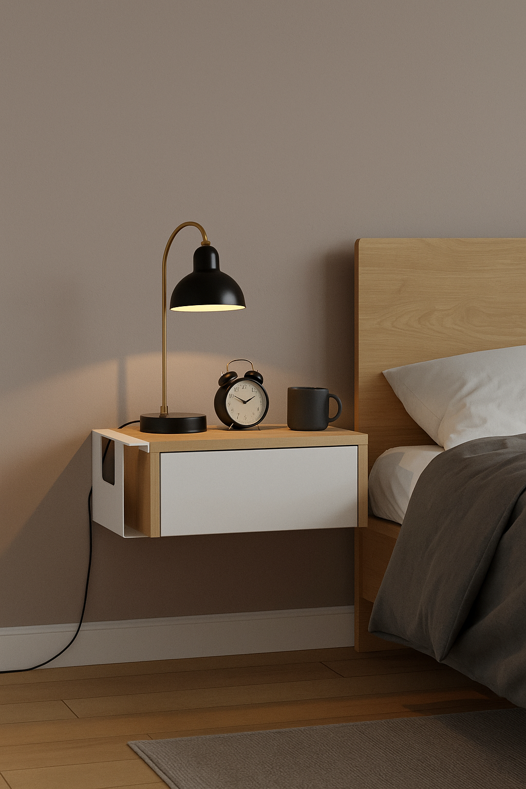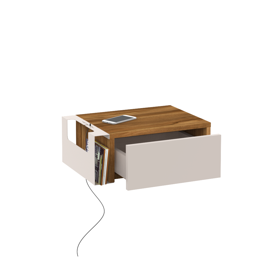 Mesa de luz flotante de diseño, con un cajón amplio y una superficie de apoyo espaciosa. En uno de sus laterales, cuenta con un accesorio funcional de chapa plegada que permite colocar libros, tablets u otros objetos personales. Además, cuenta con un práctico sistema para pasar y sujetar cables, manteniendo el espacio ordenado y libre de enredos. Ideal para ambientes contemporáneos que buscan diseño y practicidad. Su estética simple y moderna la convierte en una opción versátil para cualquier dormitorio.