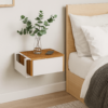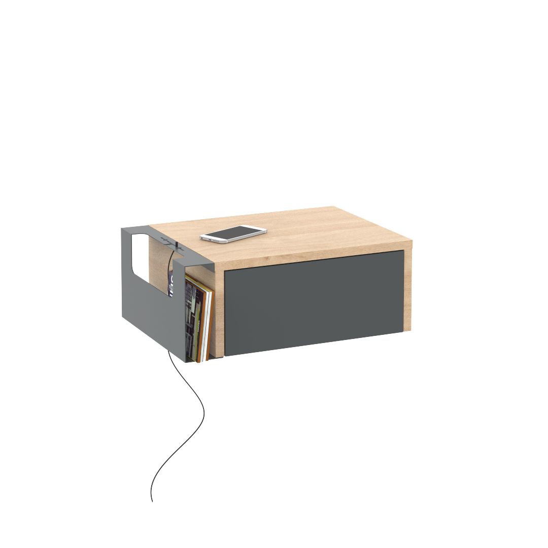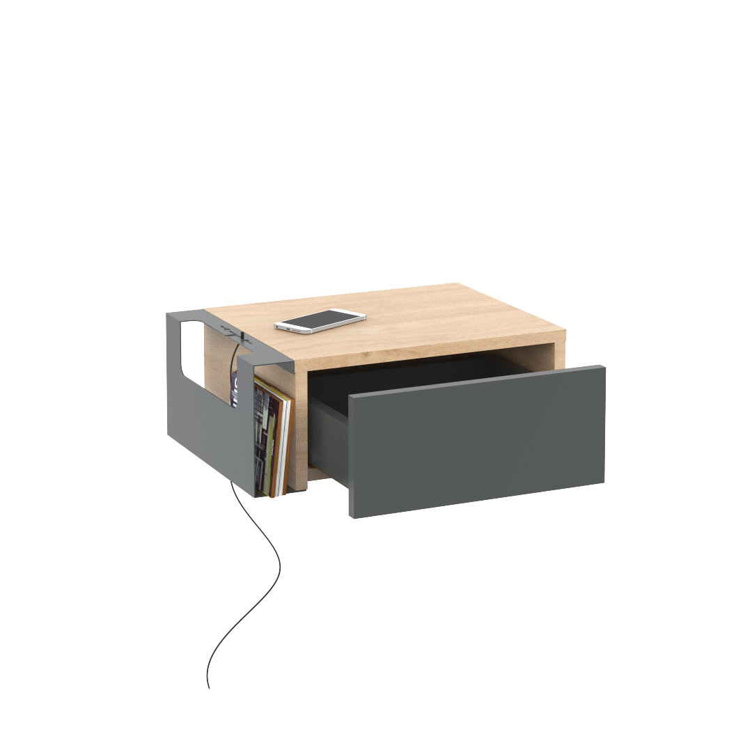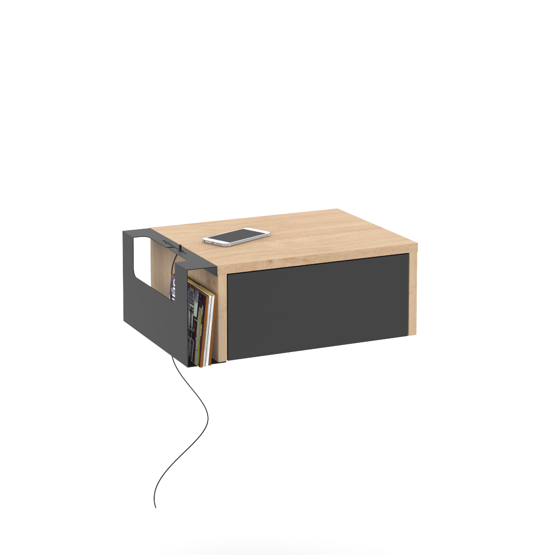 Mesa de luz flotante de diseño, con un cajón amplio y una superficie de apoyo espaciosa. En uno de sus laterales, cuenta con un accesorio funcional de chapa plegada que permite colocar libros, tablets u otros objetos personales. Además, cuenta con un práctico sistema para pasar y sujetar cables, manteniendo el espacio ordenado y libre de enredos. Ideal para ambientes contemporáneos que buscan diseño y practicidad. Su estética simple y moderna la convierte en una opción versátil para cualquier dormitorio.