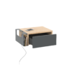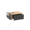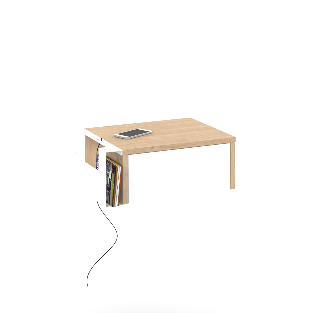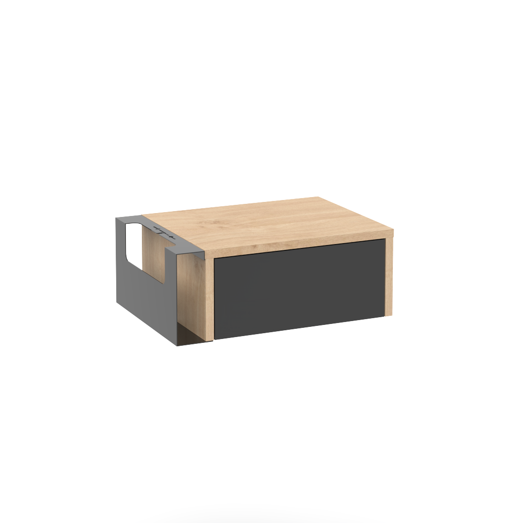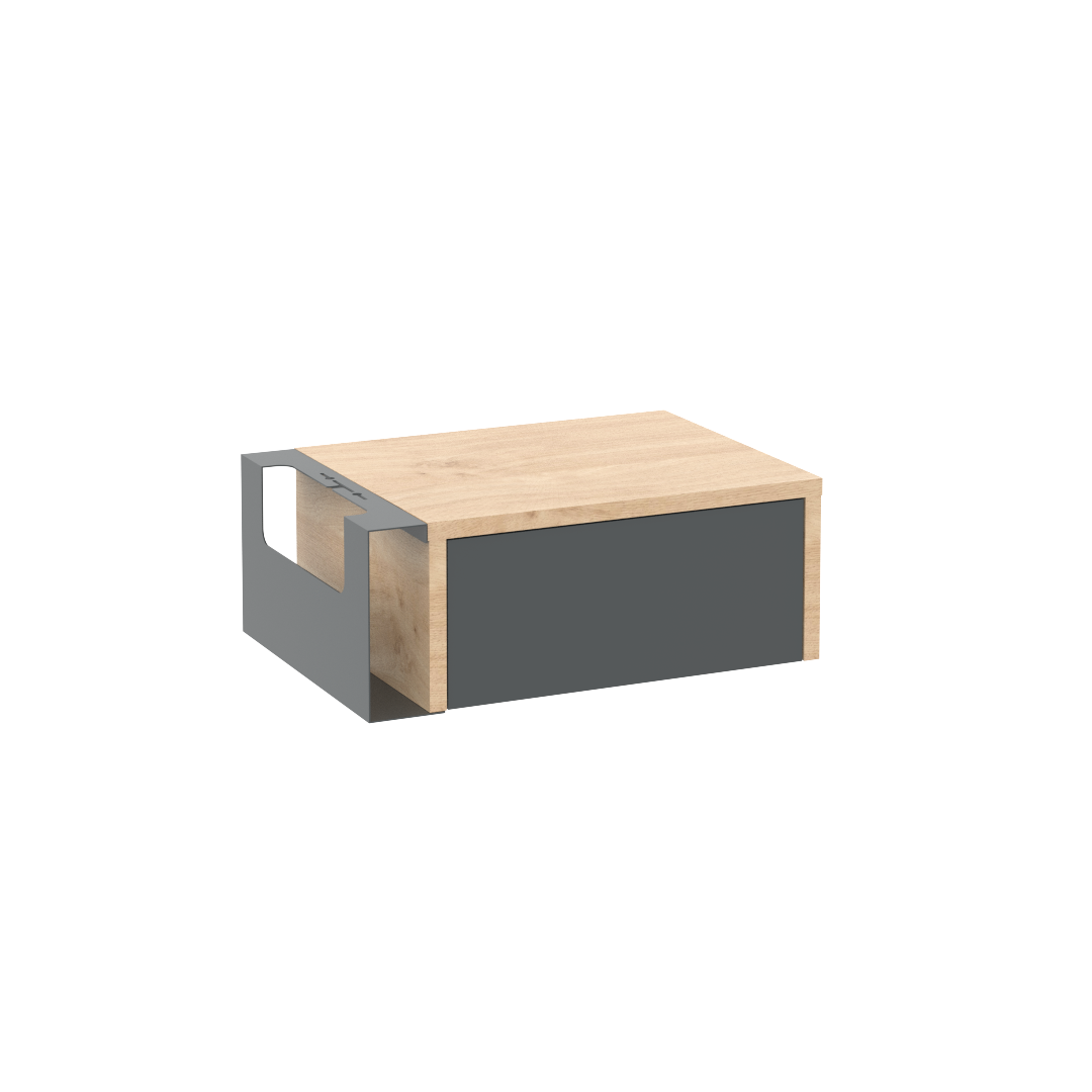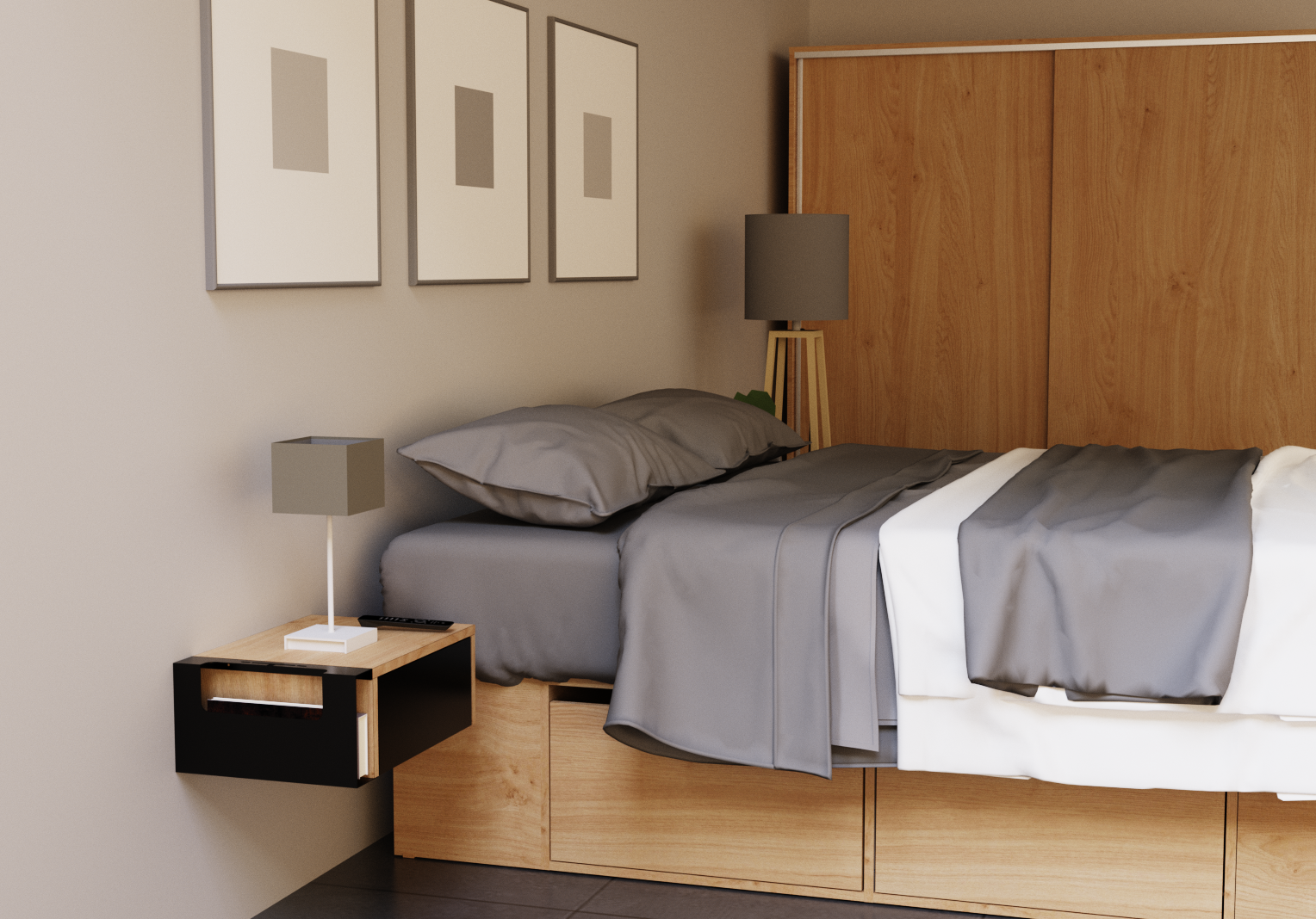 Mesa de luz flotante de diseño, con un cajón amplio y una superficie de apoyo espaciosa. En uno de sus laterales, cuenta con un accesorio funcional de chapa plegada que permite colocar libros, tablets u otros objetos personales. Además, cuenta con un práctico sistema para pasar y sujetar cables, manteniendo el espacio ordenado y libre de enredos. Ideal para ambientes contemporáneos que buscan diseño y practicidad. Su estética simple y moderna la convierte en una opción versátil para cualquier dormitorio.