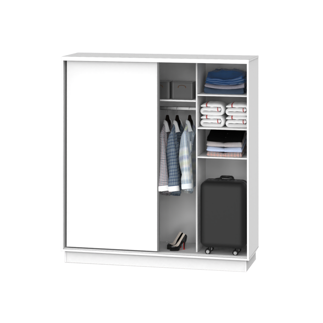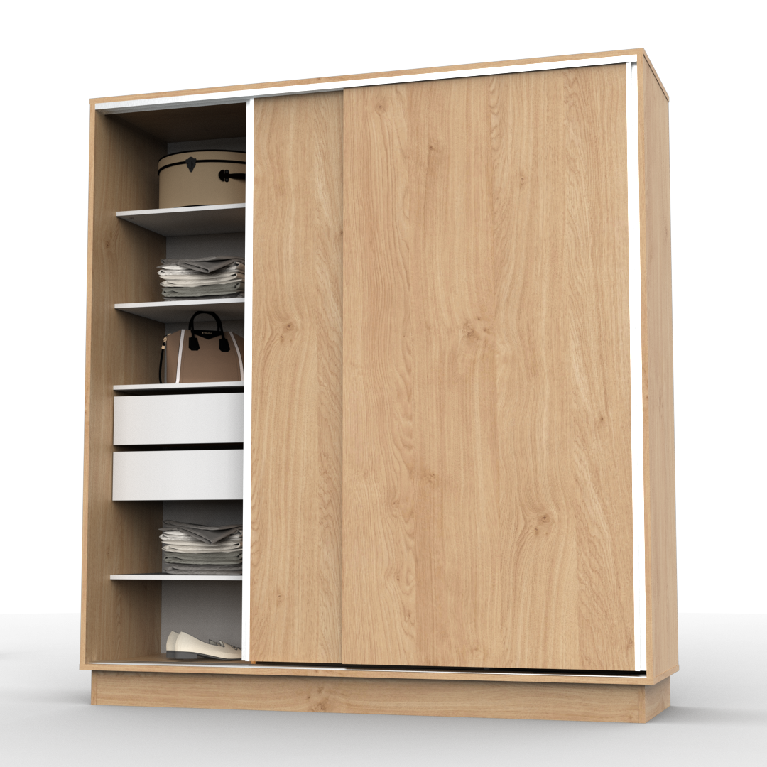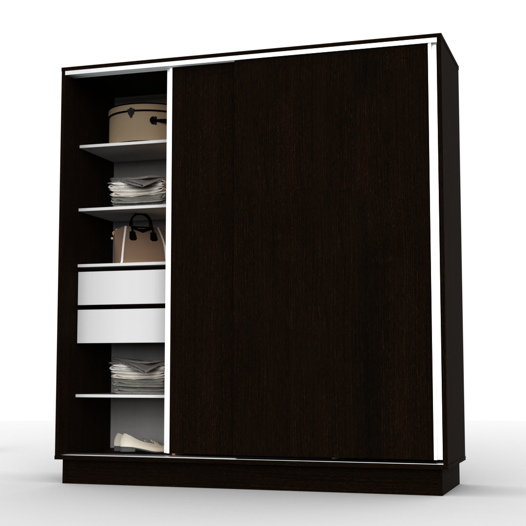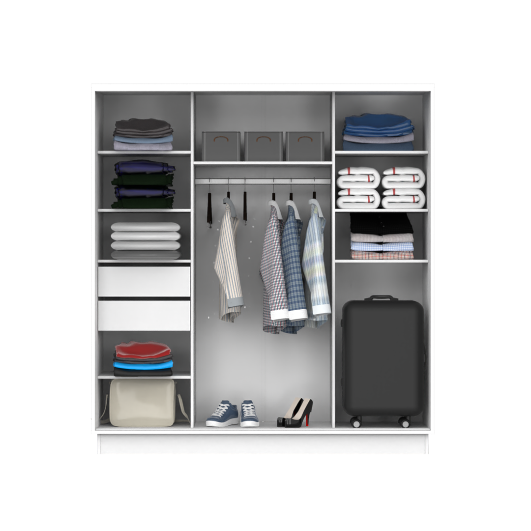 El producto cuenta con 2 cajones internos, estantes para guardado y barral para colgar ropa y accesorios. Podes encontrarlo en blanco, wengue o roble bordolino.