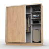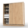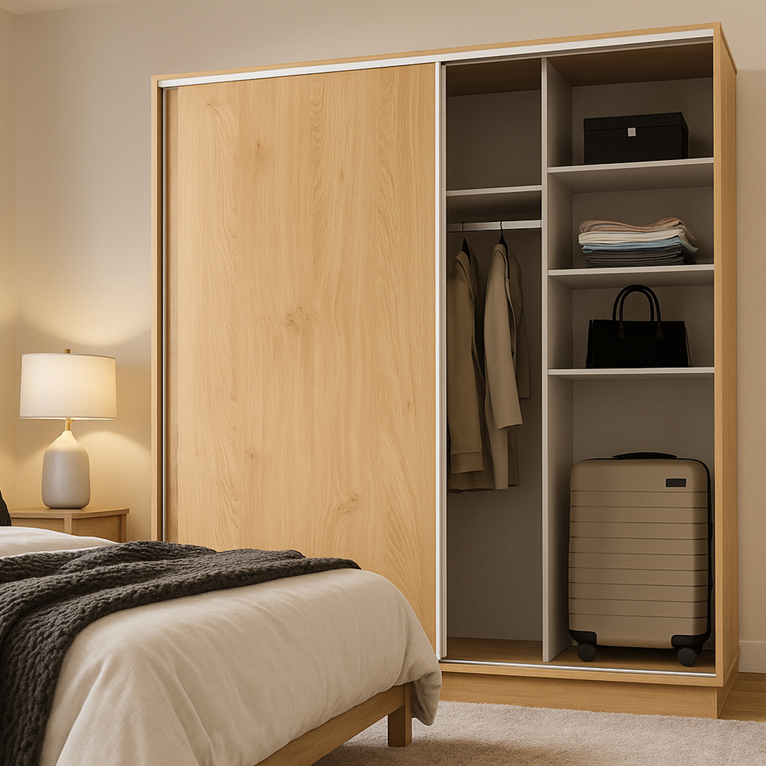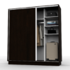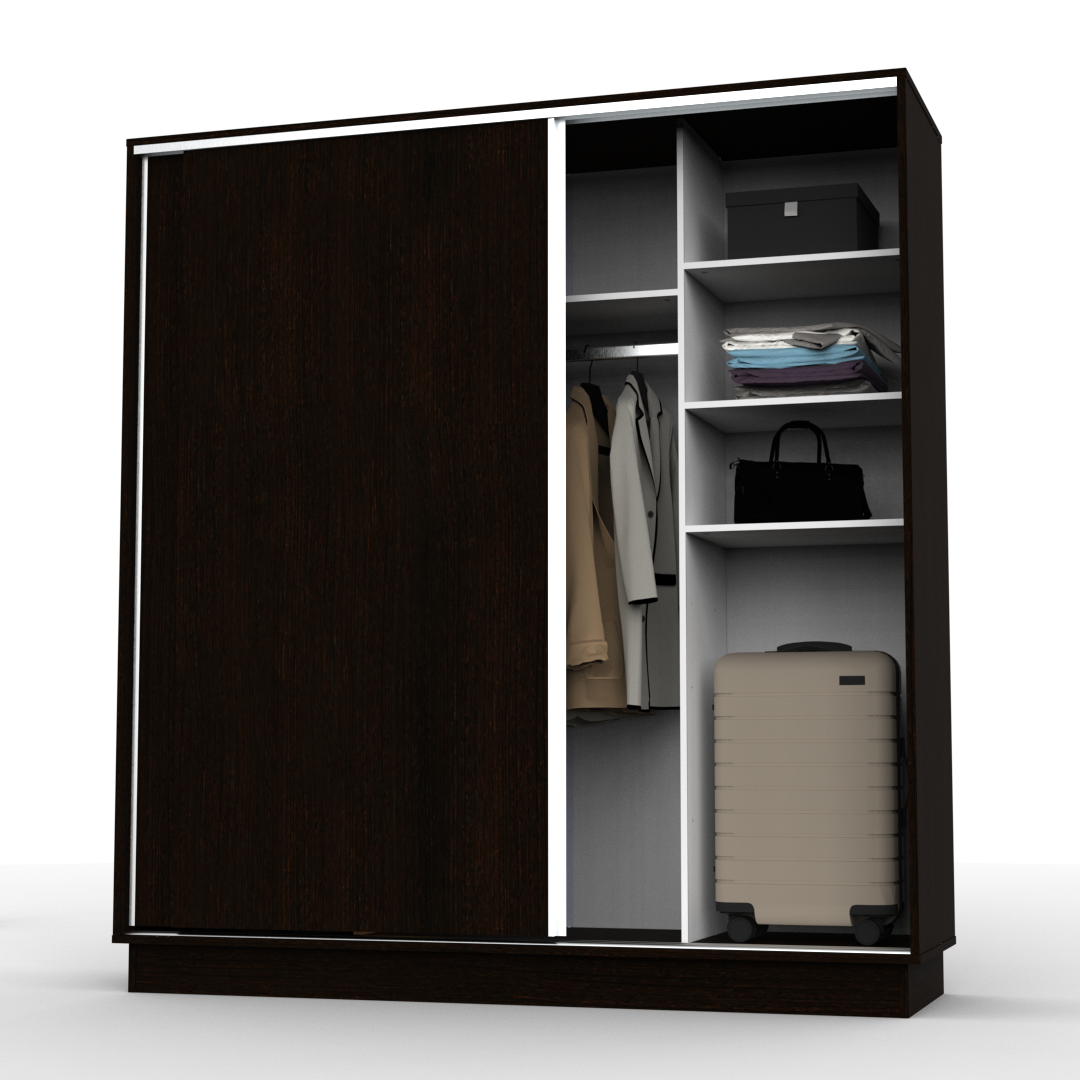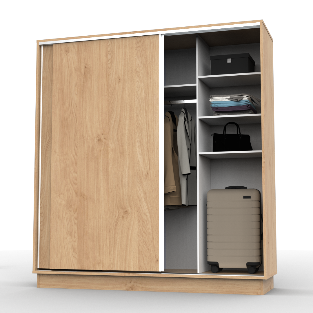 El producto cuenta con 2 cajones internos, estantes para guardado y barral para colgar ropa y accesorios. Podes encontrarlo en blanco, wengue o roble bordolino.