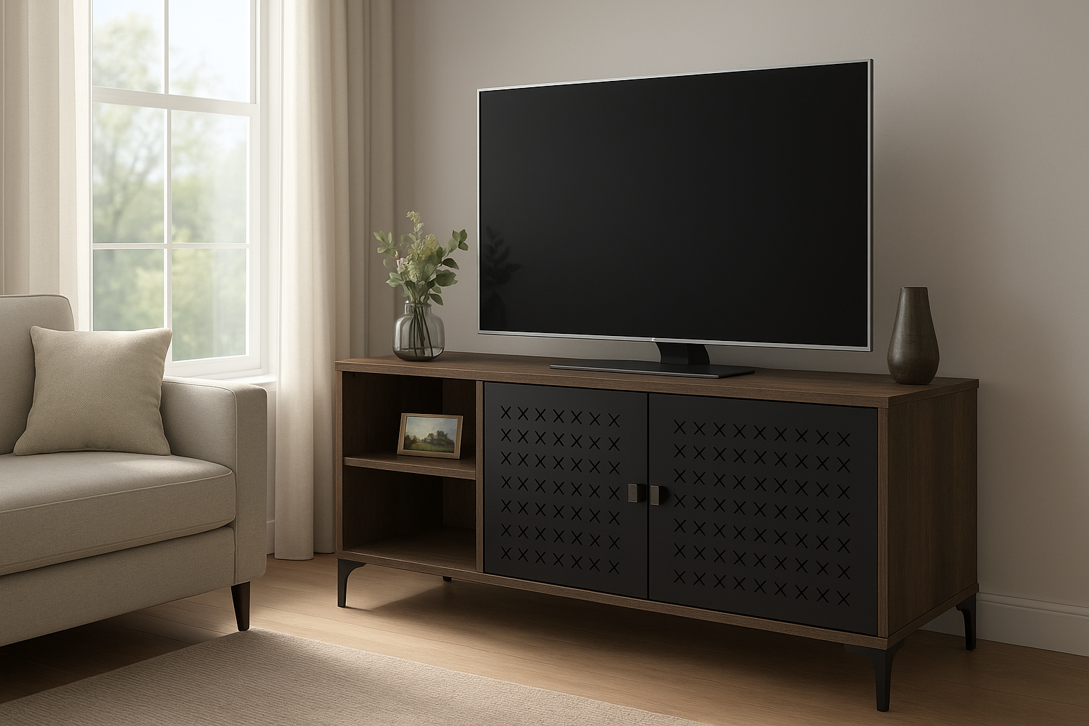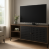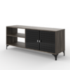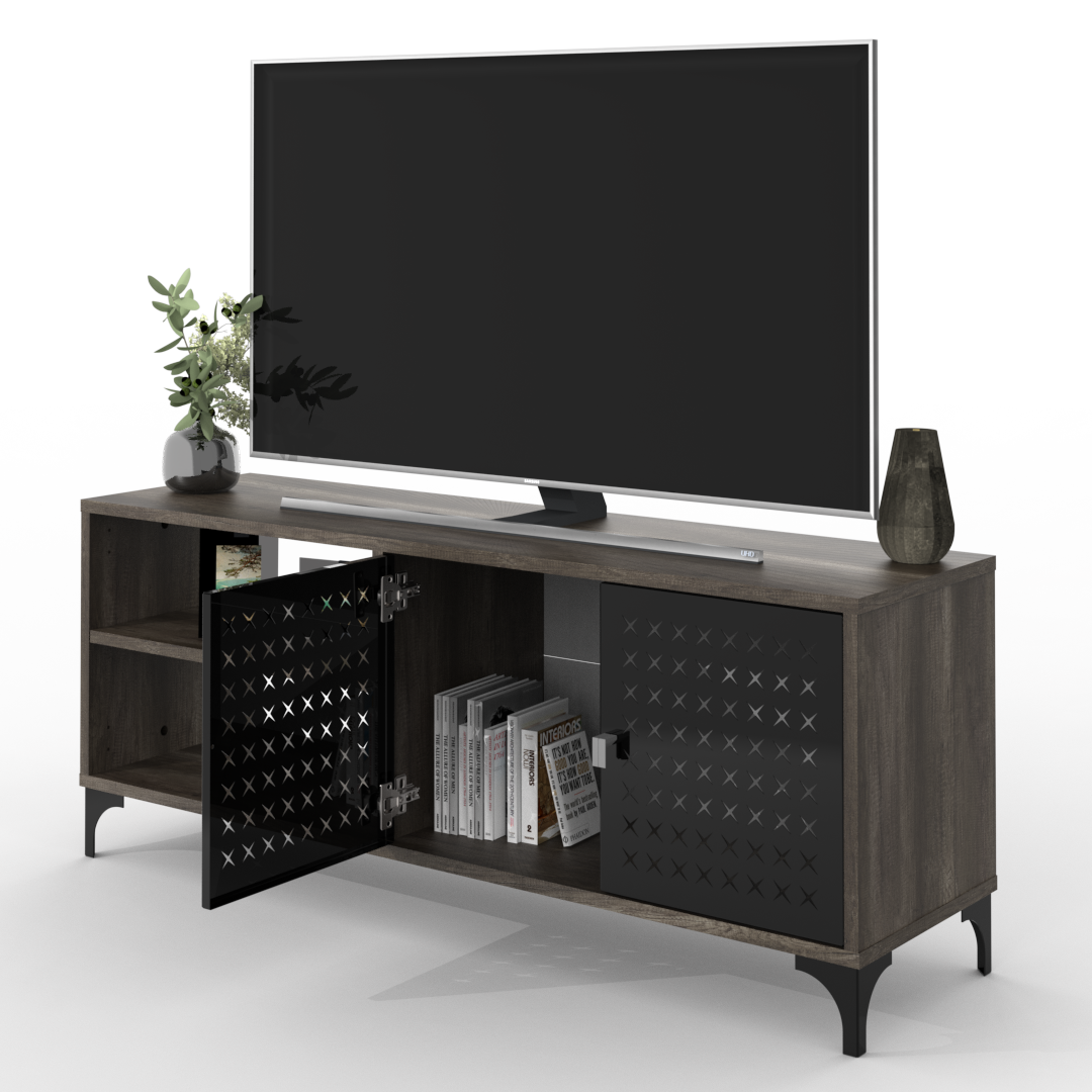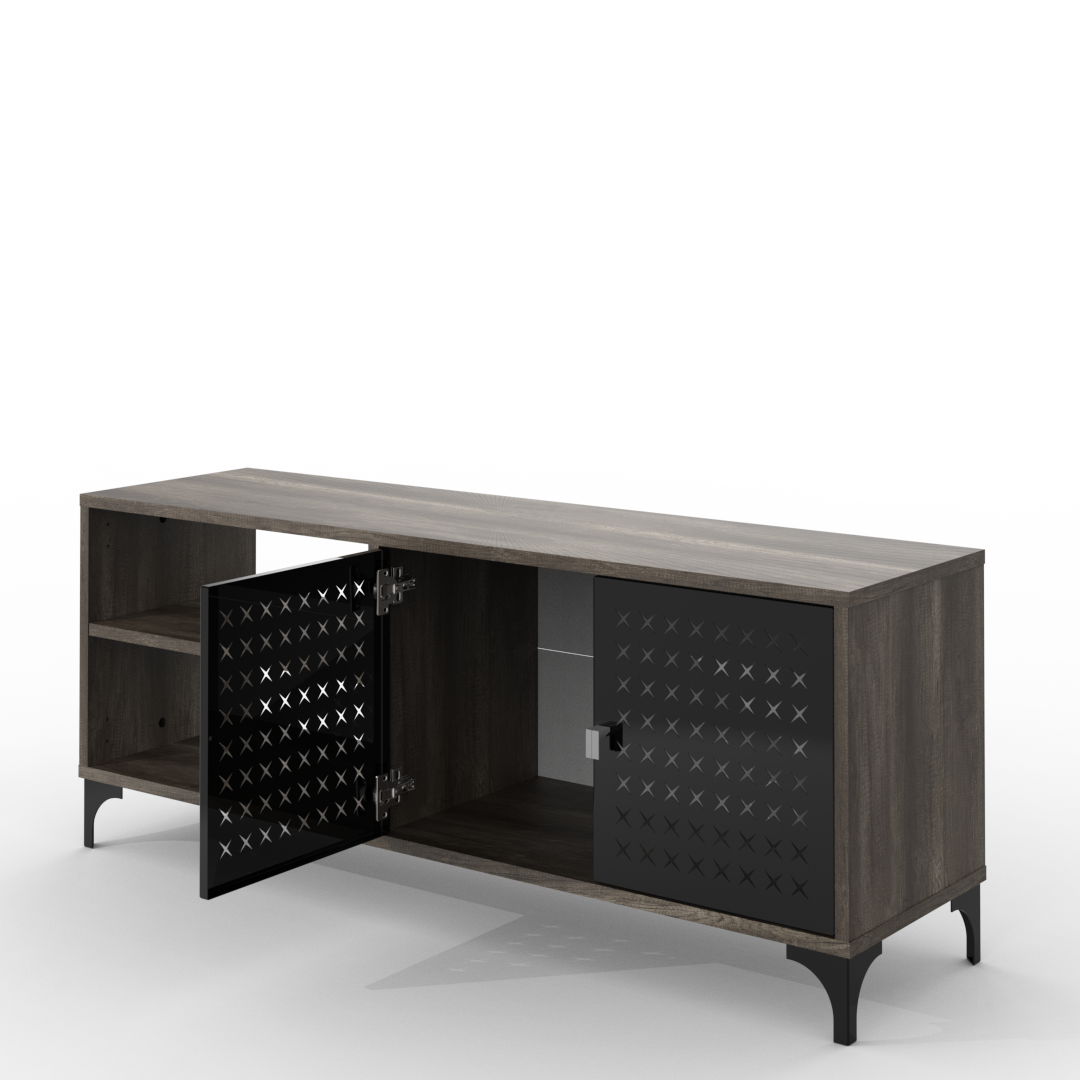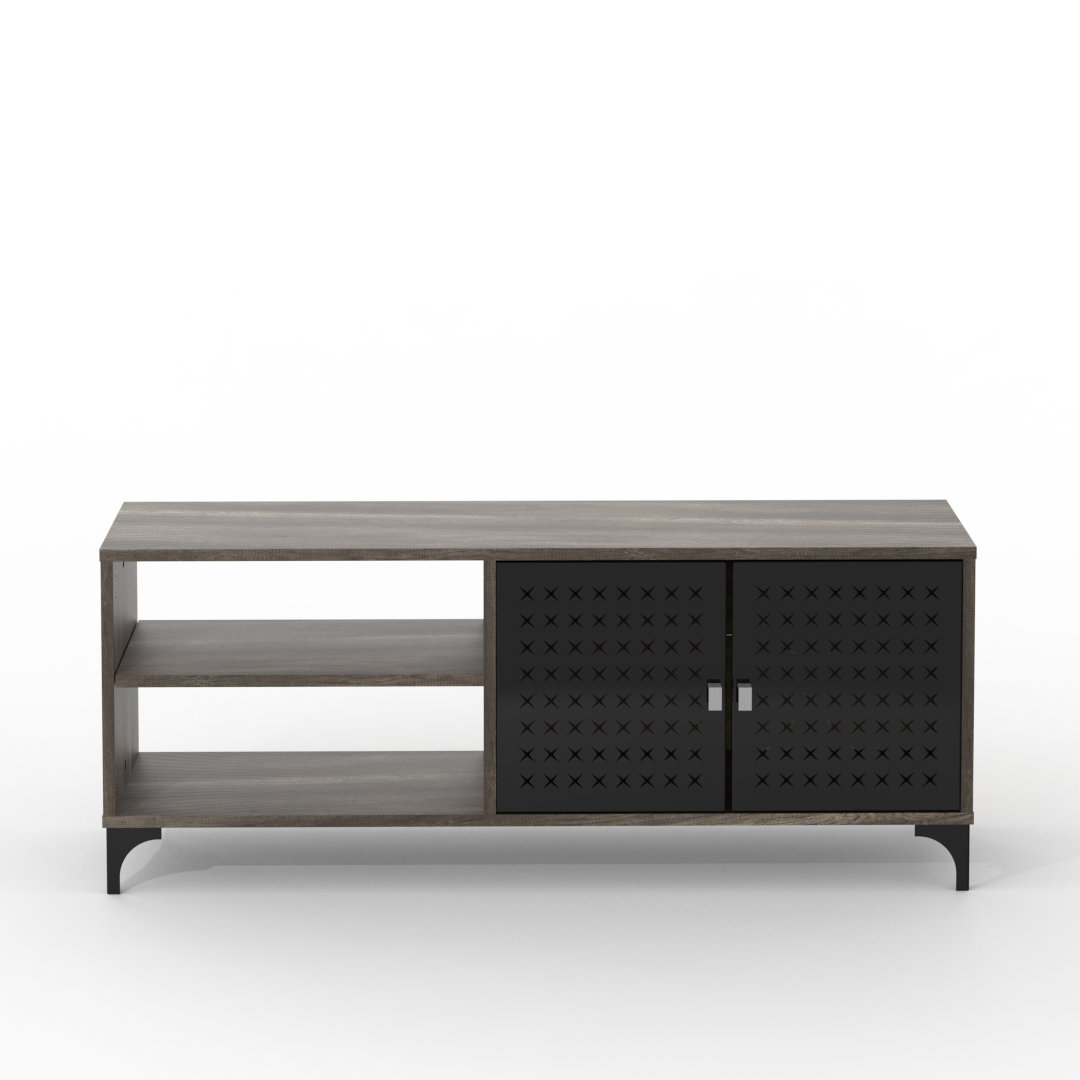 El Rack de TV Soho se caracteriza por su estilo industrial y a su vez elegante, está compuesto por un cuerpo principal de melamina y patas de chapa plegada en la parte inferior, incluye estante y un espacio de guardado con puertas para diferentes dispositivos electrónicos.