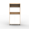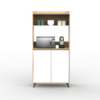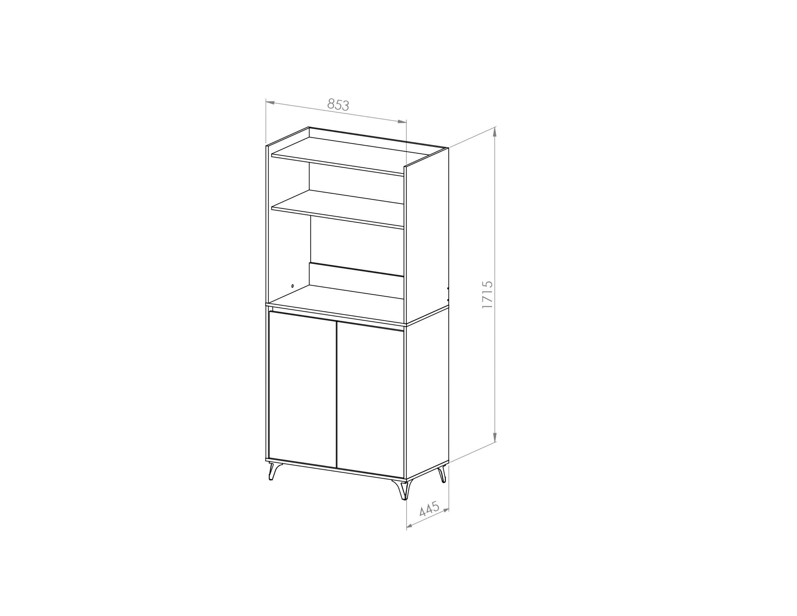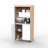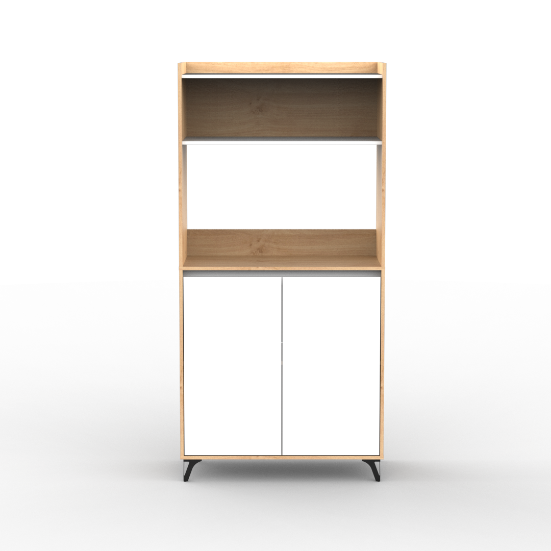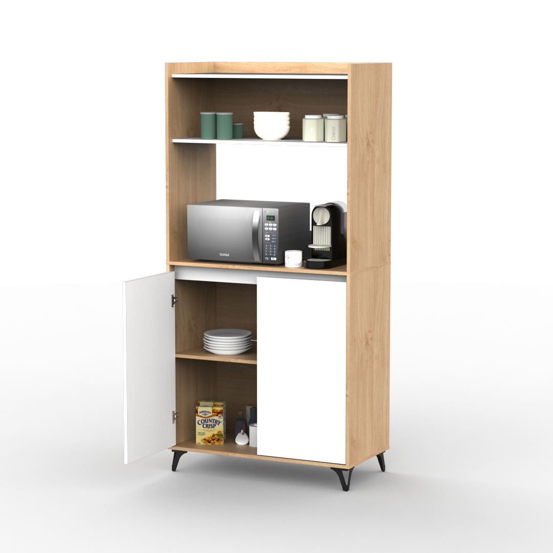 Mueble auxiliar de cocina fabricado en melamina de 15mm en combinación de color Kendal y Blanco. Ideal para apoyar microondas, freidora de aire u otros electrodomésticos, cuenta con doble puerta con estantes internos y una alzada para organizar vajilla, alimentos o utensilios. Su diseño moderno con patas elevadas aporta estilo y facilita la limpieza del piso, convirtiéndolo en una solución práctica y funcional para cualquier cocina.