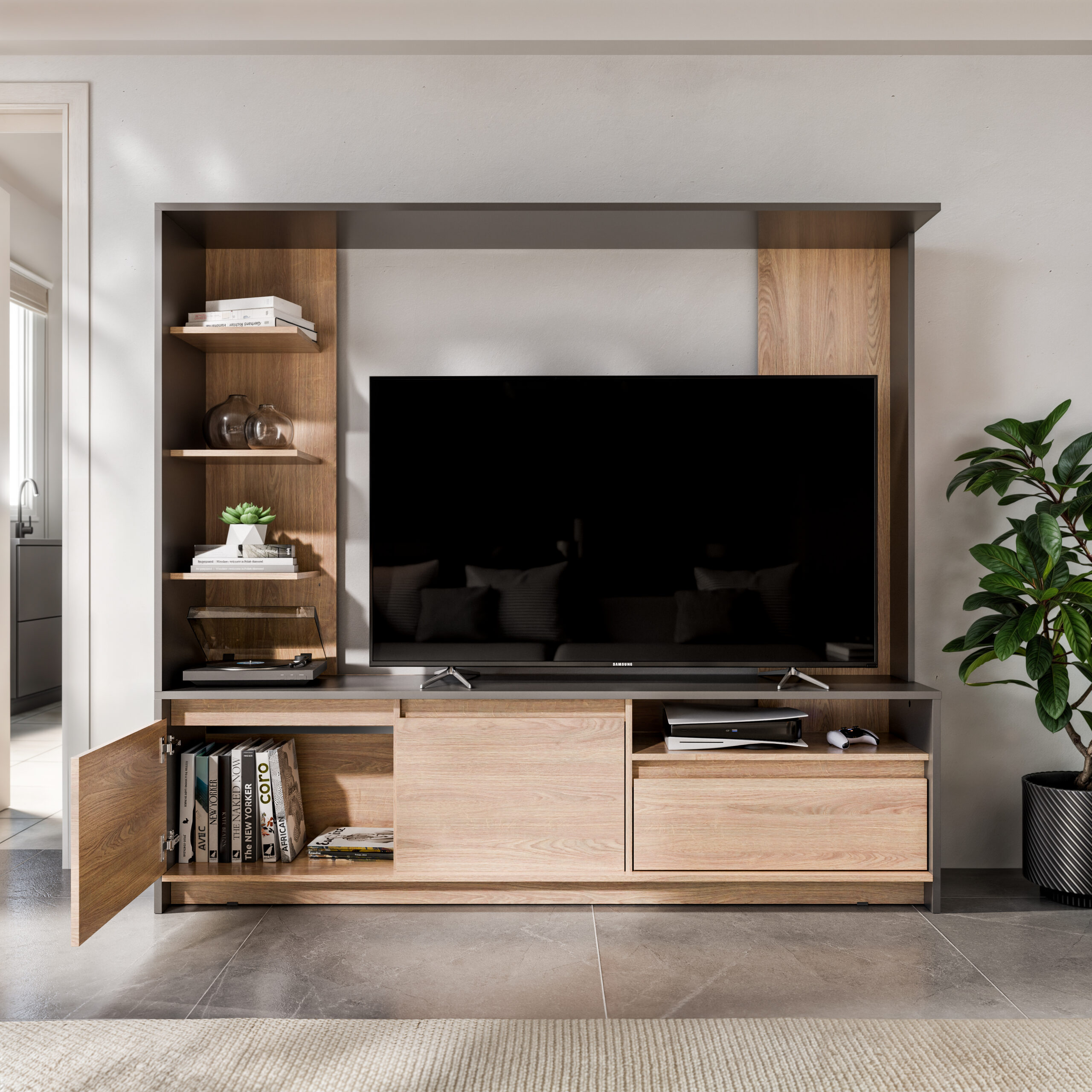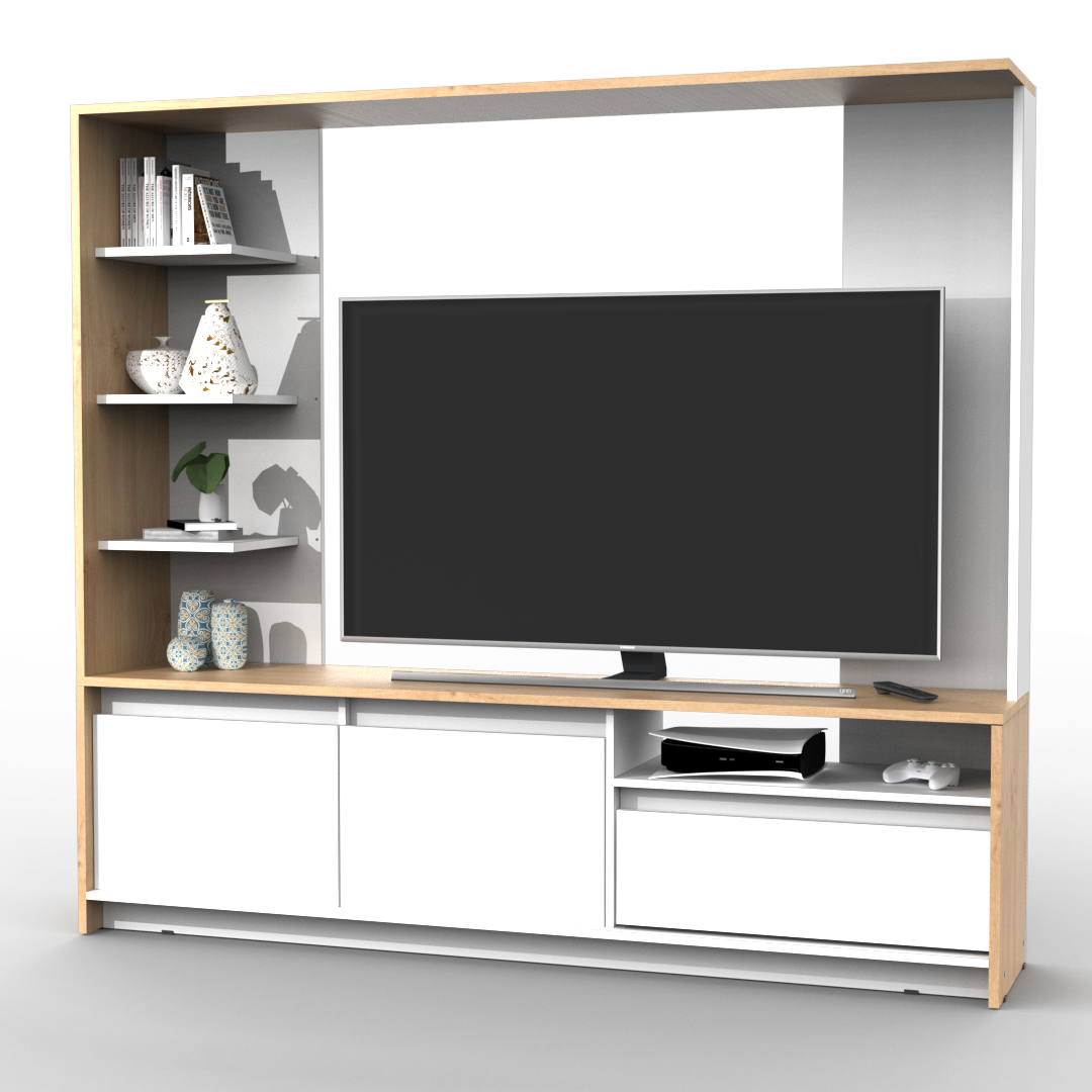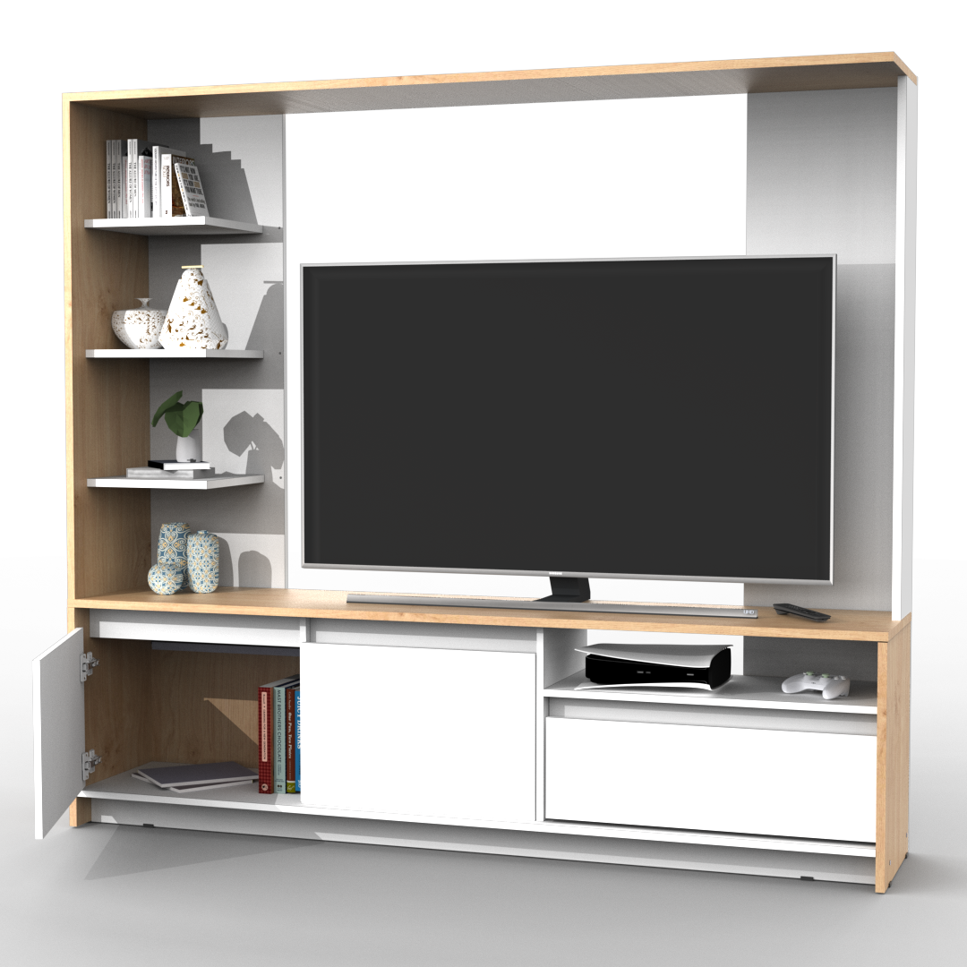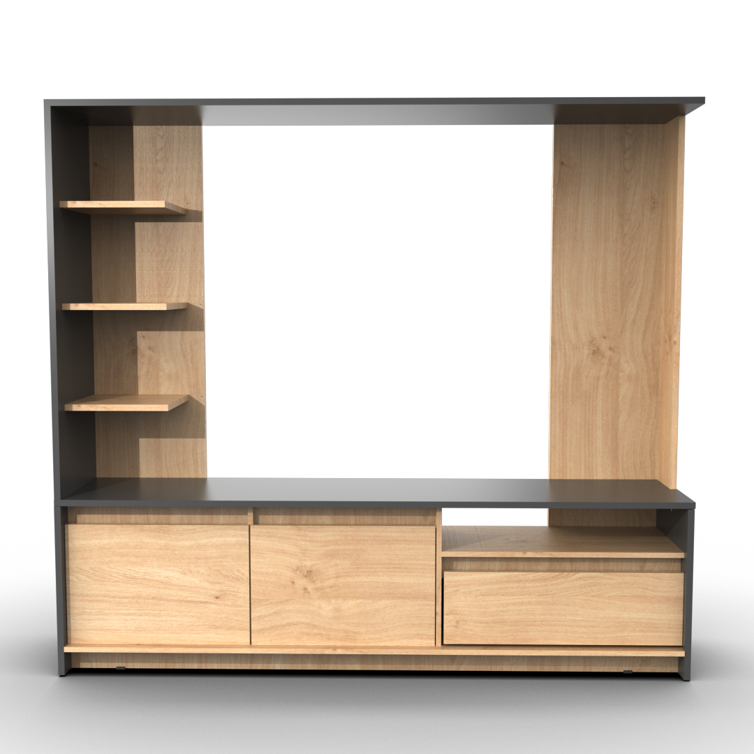 El Centro de entretenimiento, de la línea Niza, se destaca por su diseño moderno. Las puertas y cajones se abren sin necesidad de tiradores. Este versátil mueble ofrece siete espacios de almacenamiento integrándose armoniosamente en la decoración del hogar. Disponible en la combinación de Gris y Roble Bardolino.