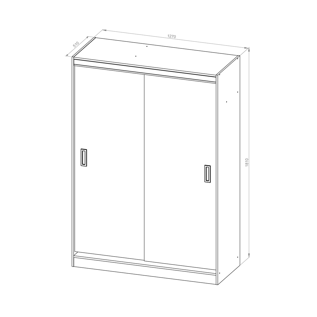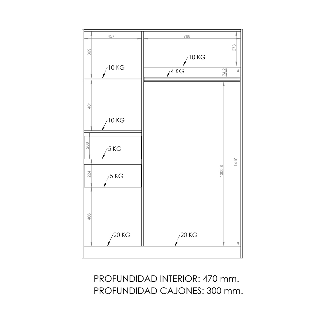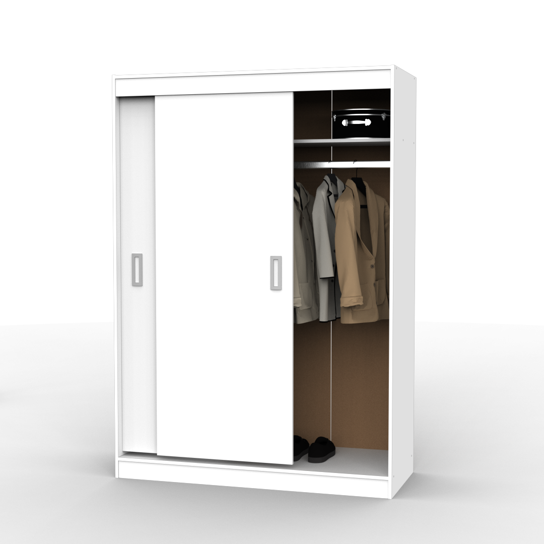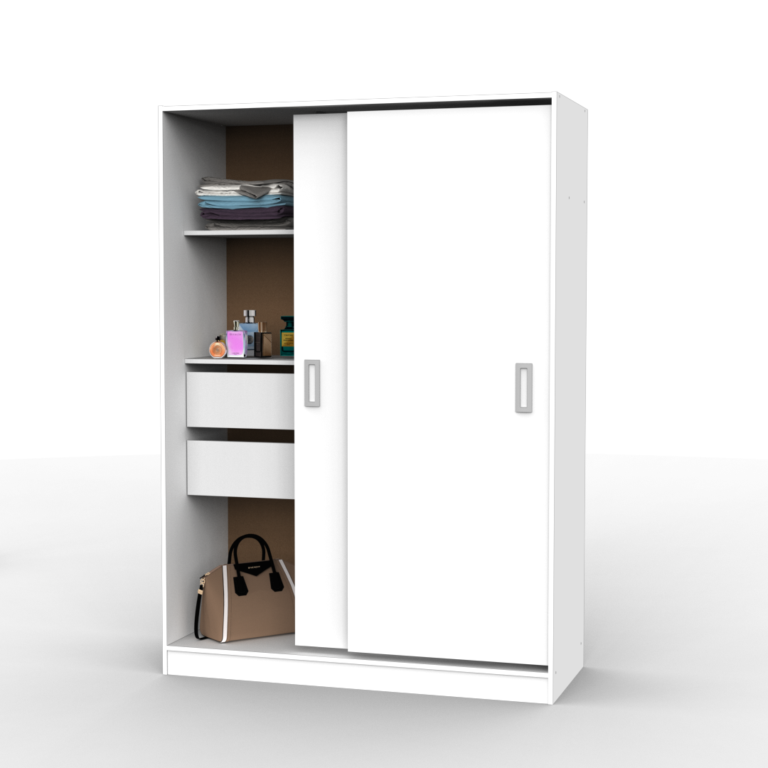 Esta versión de 130 cm de ancho está compuesta por puertas correderas con herrajes de última tecnología, con manijas de PVC, y en su interior cuenta con tres estantes, dos cajones internos y un amplio perchero. Resaltándolo de esta forma de los demás placares de la marca.