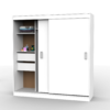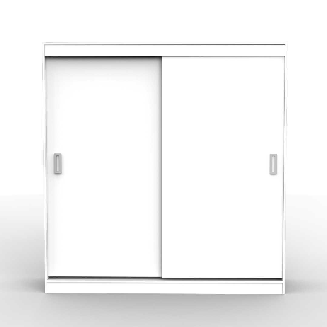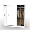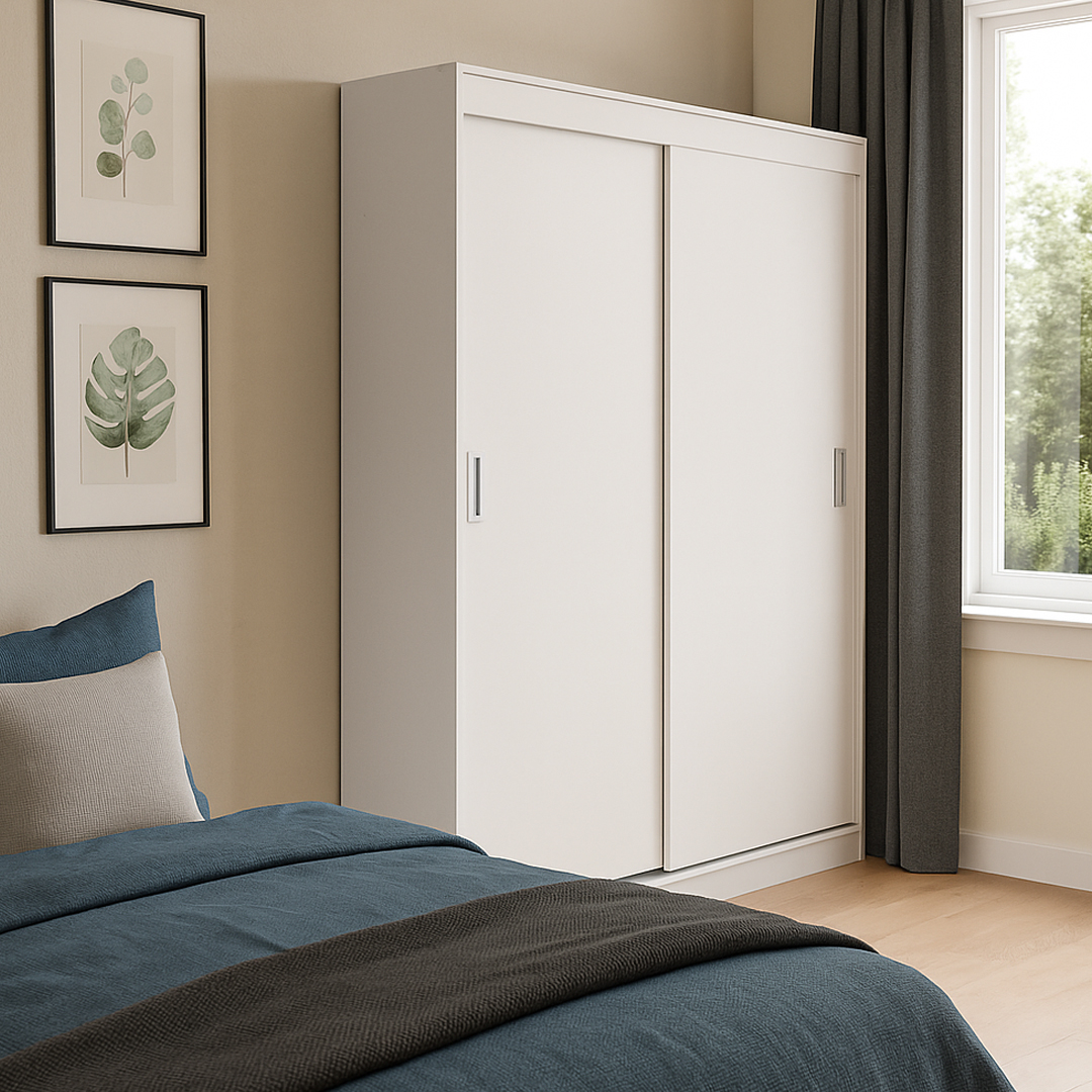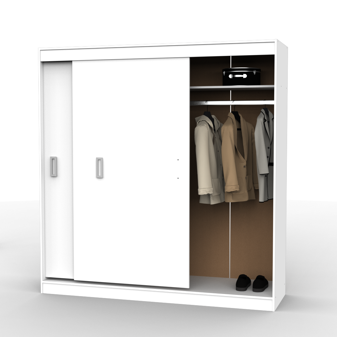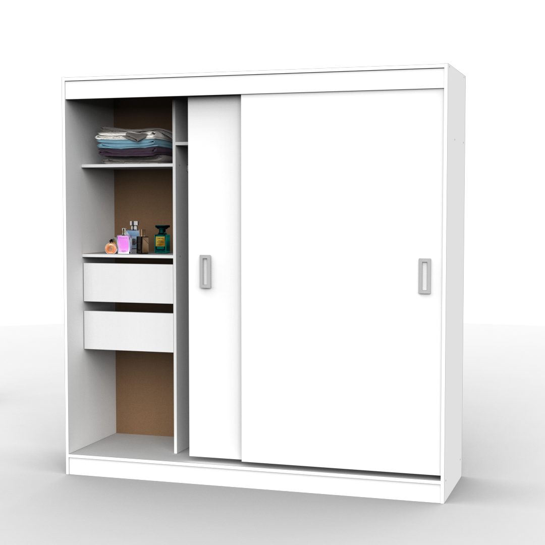 Este placard está compuesto por dos puertas correderas y en su interior cuenta con estantes, cajones internos y un amplio perchero.