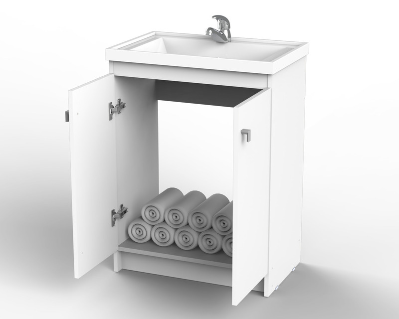 El vanitory es un mueble de baño que cuenta con un espacio inferior de guardado con dos puertas. Construido en melamina de color blanco.